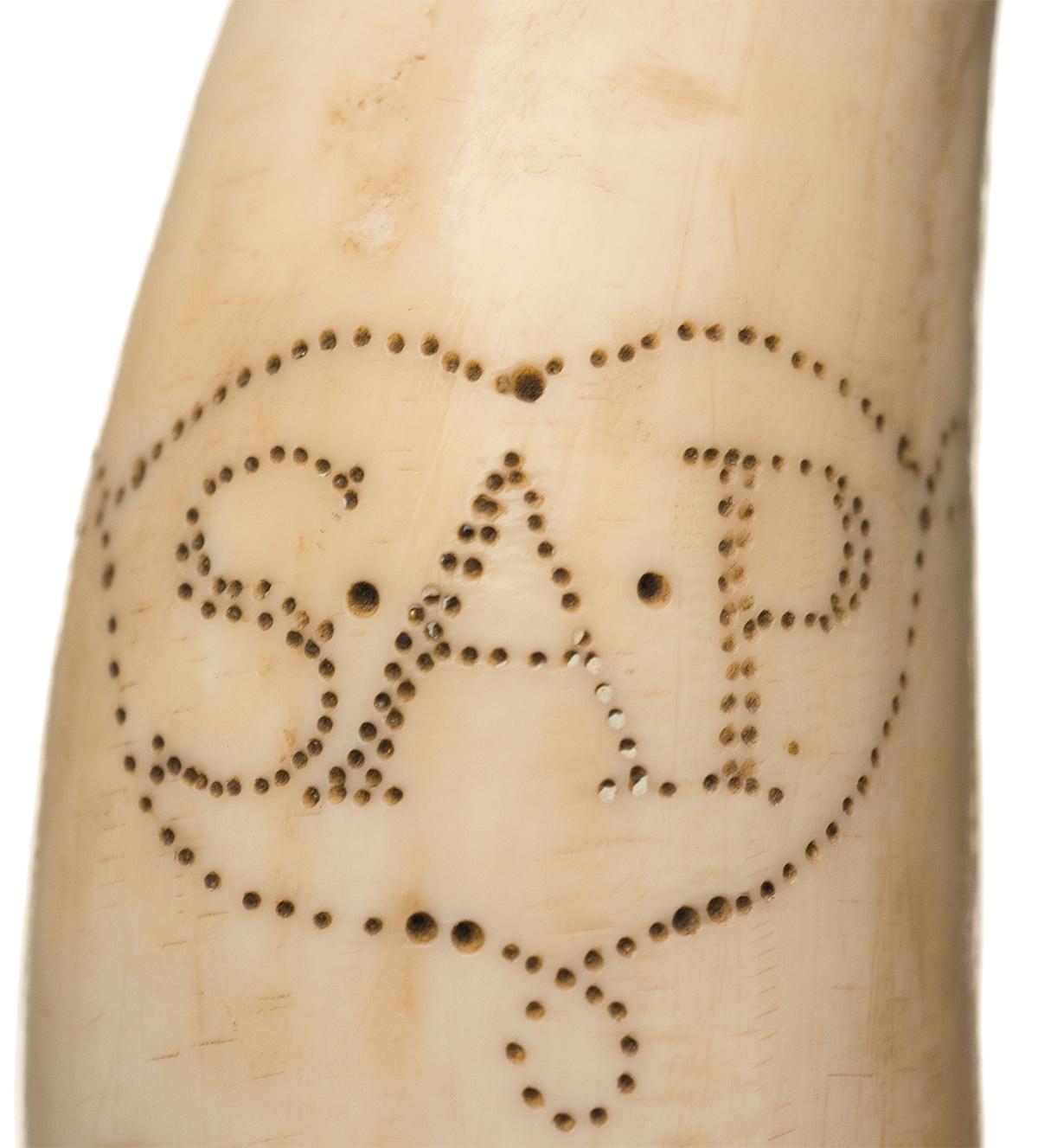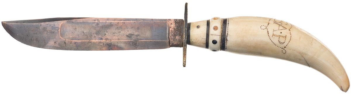 This knife has a 5 7/8" blade marked SD&Co, which was copper plated to provide additional resistance to sea-spray induced rust. Brass diamond guard. Whale tooth handle scrimshawed with the initials "S.A.P." (likely done by a 19th century whaler) and adorned with inlaid mother of pearl circle on the ivory tooth inserted ring flanked by black colored baleen bands. OAL: 11".