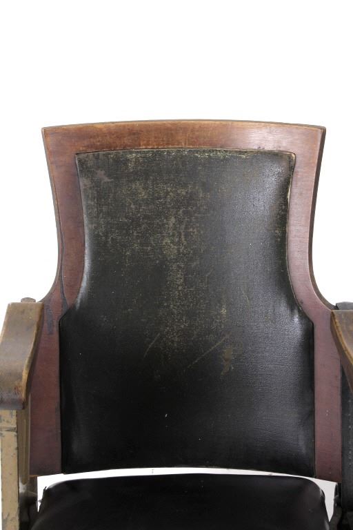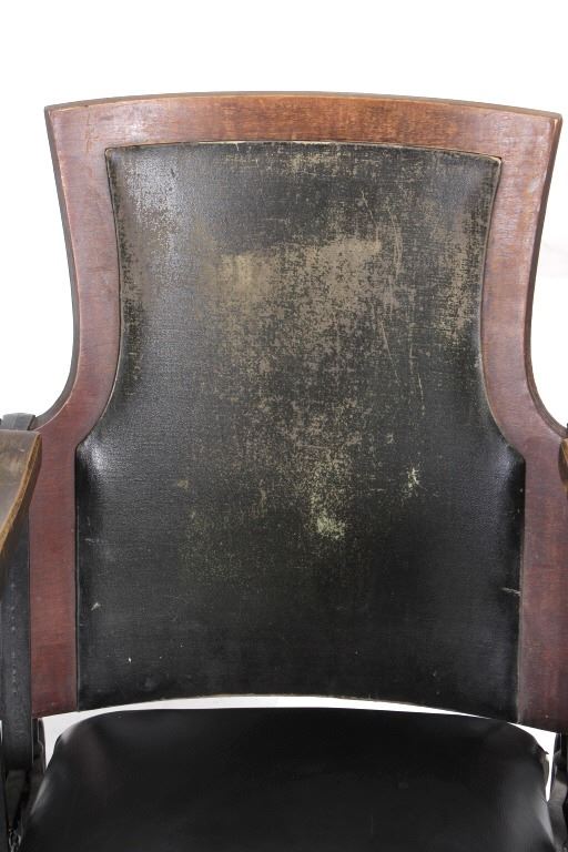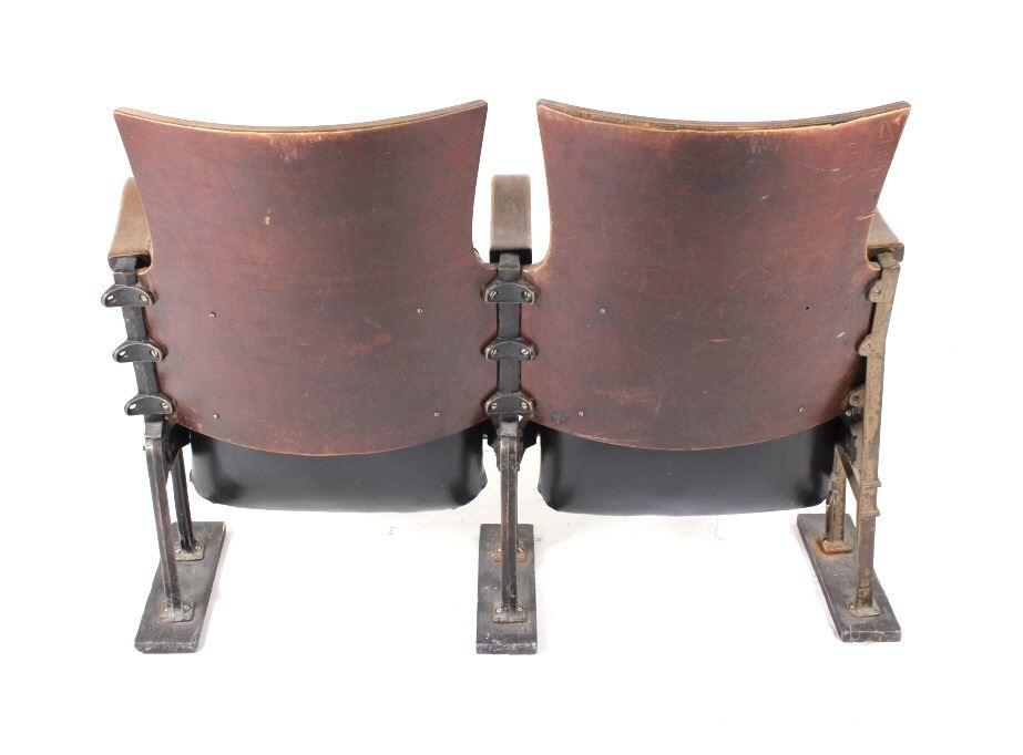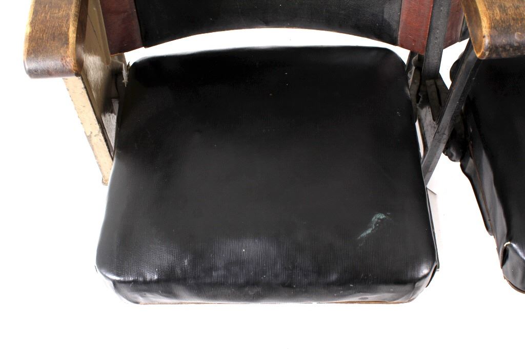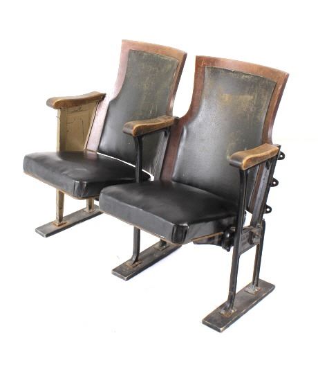 Offered for your bidding pleasure is this pair of Early Theater Chairs from Saskatchewan, Canada. The chairs are constructed primarily of wood and metal with faux leather seats. The seats are able to fold up against the back rests. The chairs are from Saskatchewan, Canada and were used in a theater in the early 1900's. The piece shows a mostly wood construction with metal sides and padded seats covered in faux leather. This wonderful item shows good condition and measures 40" W, 32 1/2" tall, 19 1/2" deep.