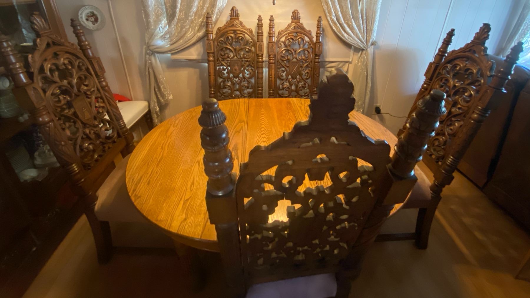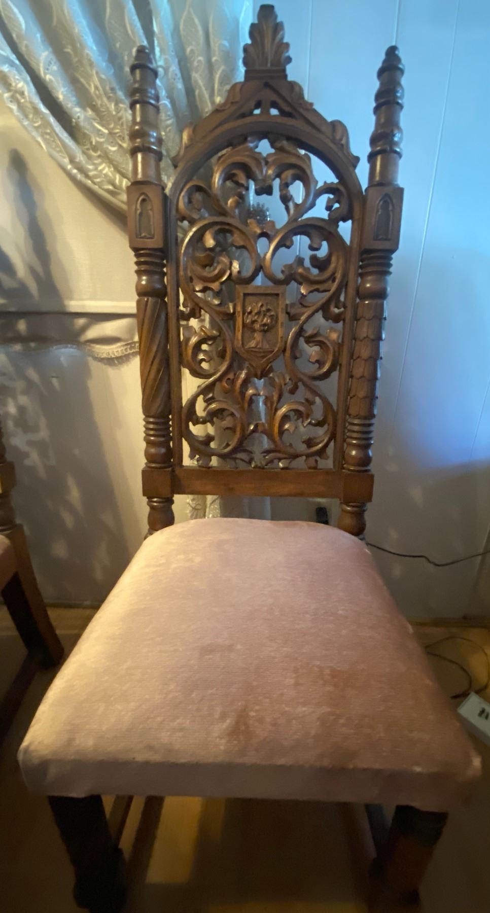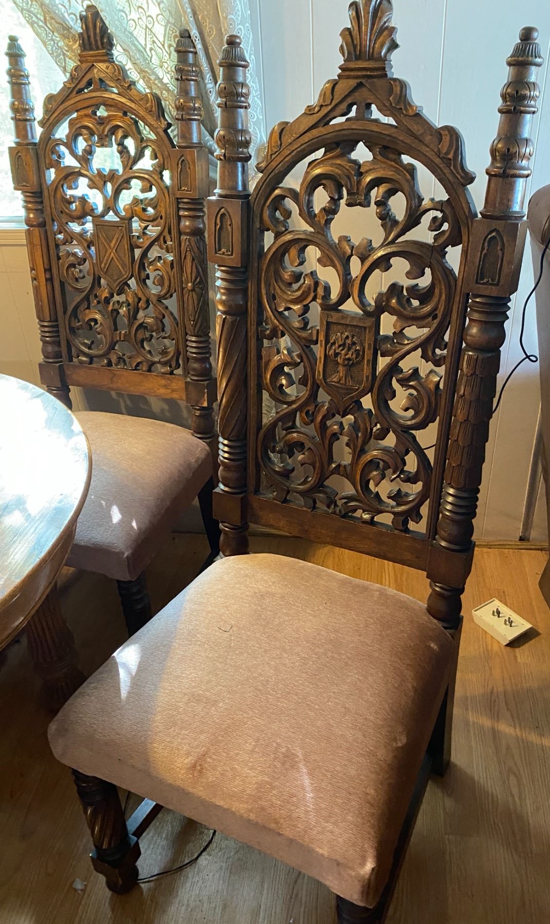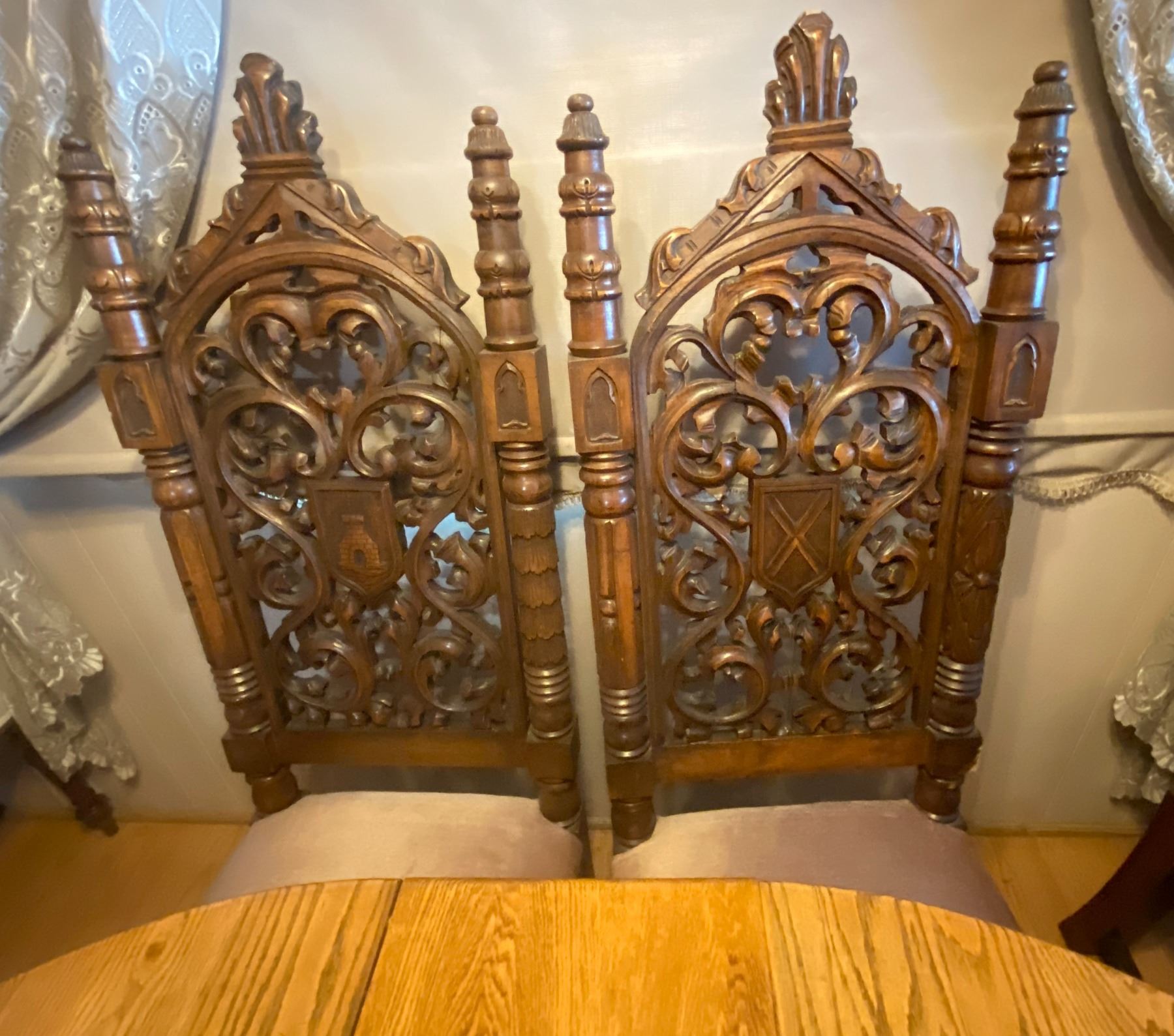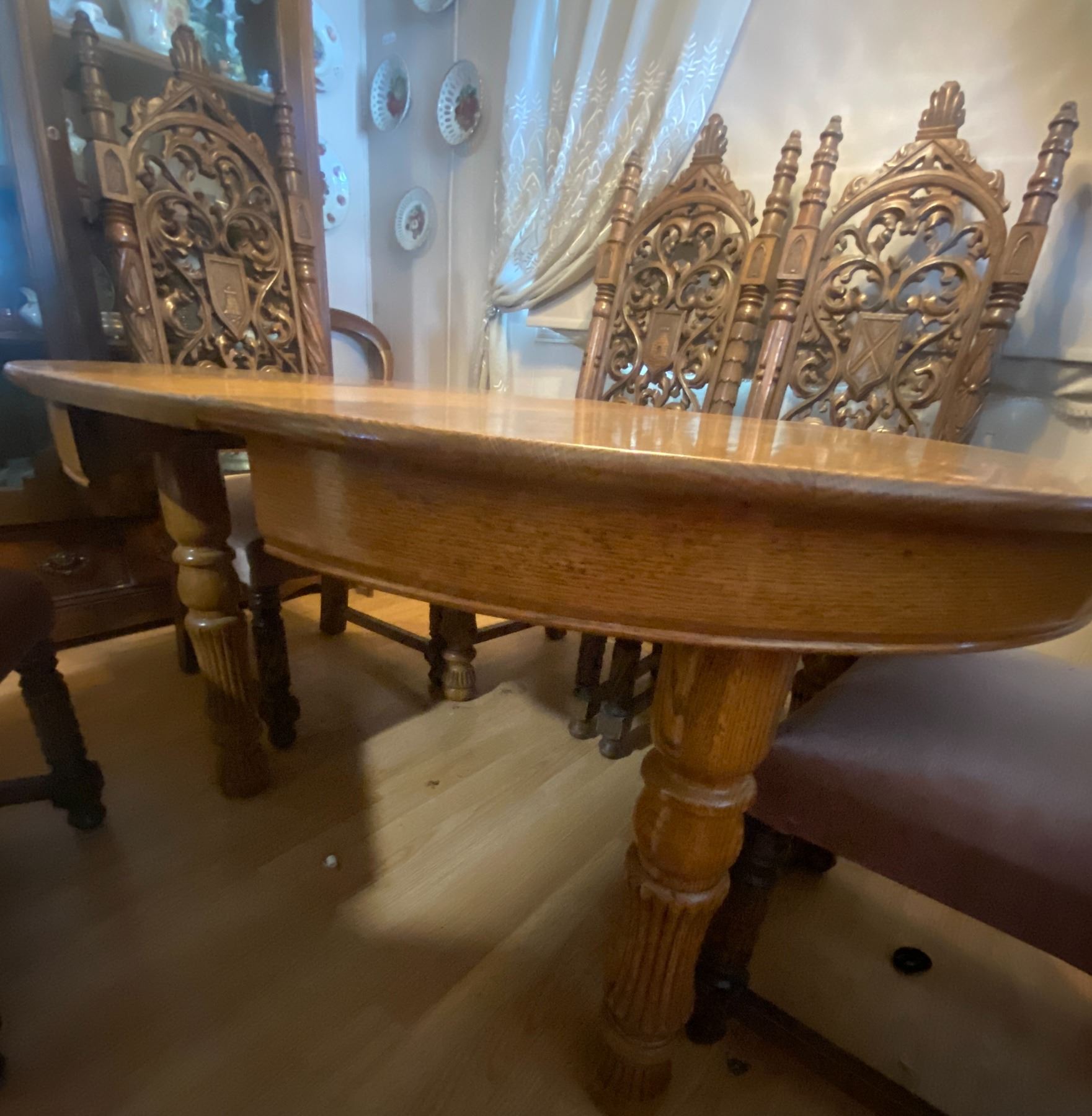 19th Century Set of 5 Carved Walnut English Antique Chairs with Oak Table 54W x 42D x 28H