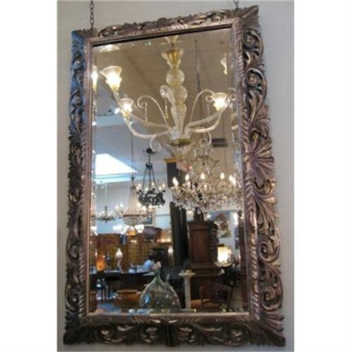 19th century solid hand carved oak mirror with silver leaf, original beveled mirror.</em></td>