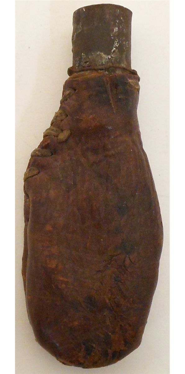 4 1/2" leather shot flask with a metal spout, missing cork or cap, hand sewn leather. Great condition.
