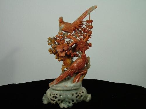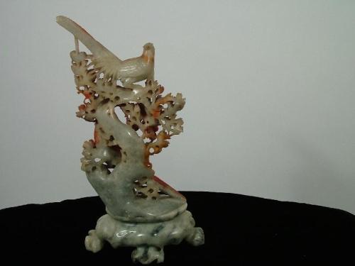 (Japan Late 19th Century) Carved soap stone figure of birds enjoying floral nectar, very skillfully carved, 14" by 11".