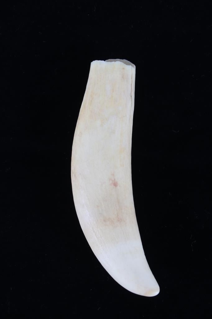 This lot consists of two antique sperm whale teeth. These teeth most likely date to the late 19th to early 20th century and came out of an old collection housed in Arizona. The larger tooth measures approx. 5” in length, approx. 1” across the tapered base and is especially solid with little hollow cavity at the bottom. It is a fine classically curved shaped specimen tooth that has not been sanded or altered. It displays an lovely cream and beige aged patina. The smaller tooth measures approx. 4 ¼” in length and 2” across the base. It too displays an attractive creamy aged patina and also appears to be in its mostly specimen condition without being overly polished. Most sperm whale teeth today have been bought up by scrimshanders and decorated with their unique art. Specimen examples are difficult to find today. These would make superb displays as from a distant time when whale oil illuminated the civilized world. The teeth weigh 10oz. with the longest measuring 5 1/4" long.*