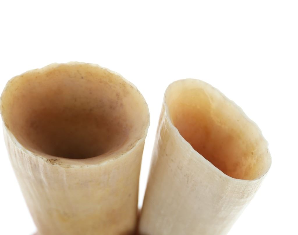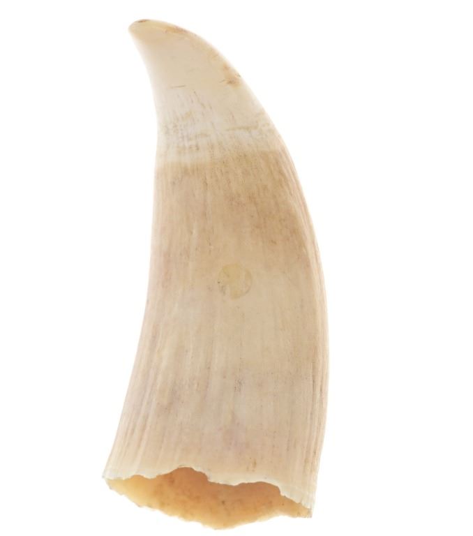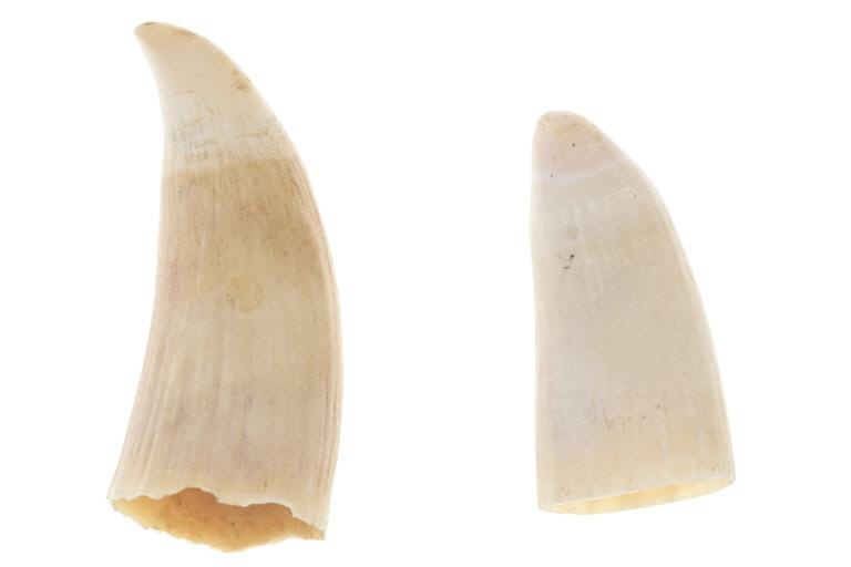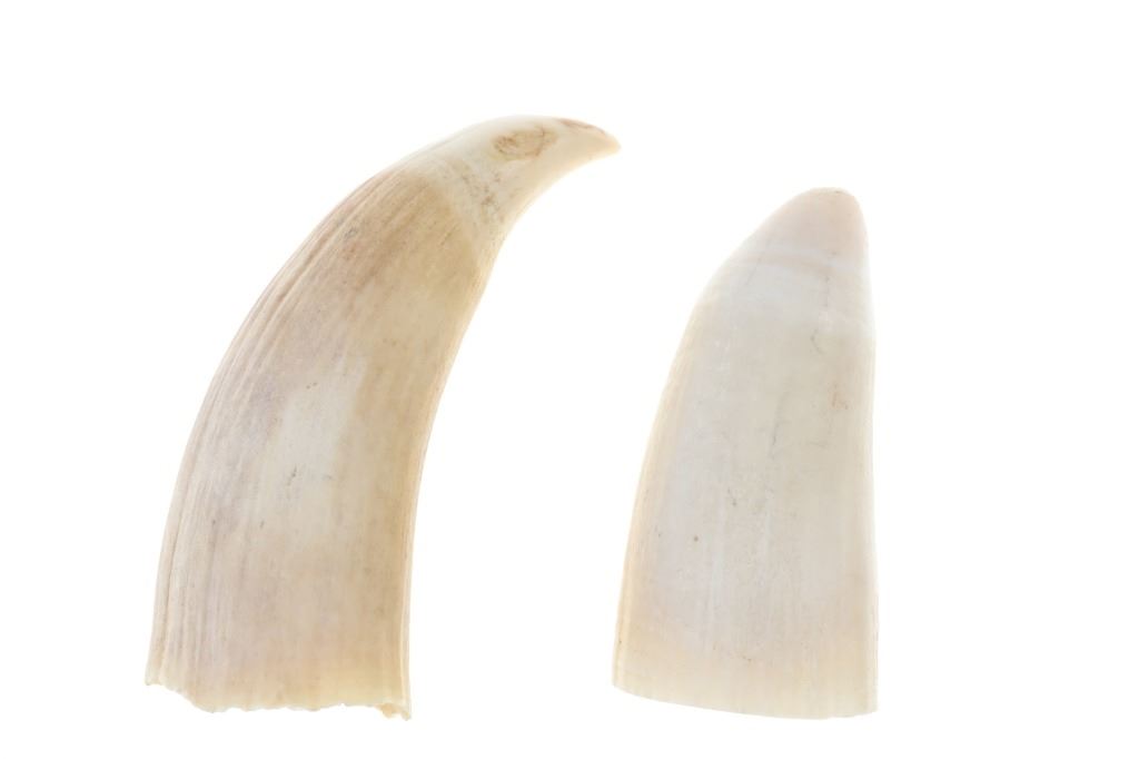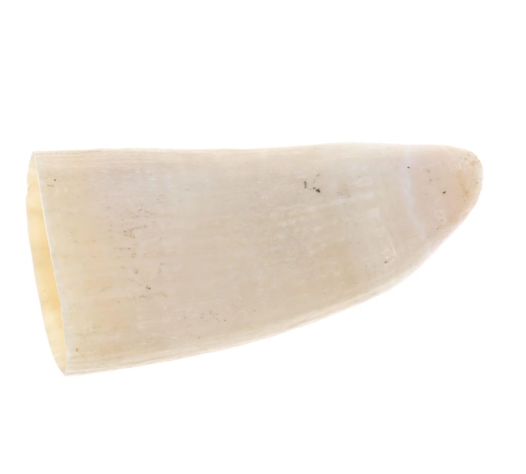 Lot consisting of two antique sperm whale teeth. These teeth probably date to the late 19th and came out of an old collection housed in Arizona. The larger tooth measures approx. 4” in length and approx. 2” across the base. It is a fine classically curved shaped specimen tooth that has not been sanded or altered. It displays an lovely cream and beige aged patina. The smaller tooth measures approx. 3 ¼” in length and 1 ½” across the base. It too displays an attractive creamy yellowish aged patina. It also appears to be in its specimen condition without being polished. Most sperm whale teeth today have been bought up by scrimshanders and decorated with their unique art. Specimen examples are difficult to find today. Superb display items from a distant time when whale oil illuminated the civilized world. Sperm Whale Tooth (2). These teeth are both Antique pre-1900.