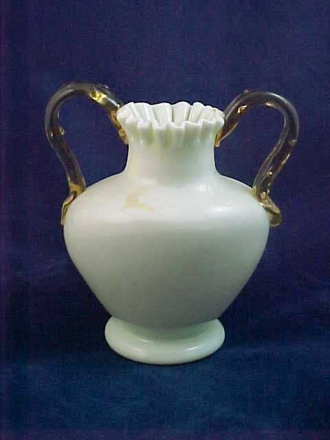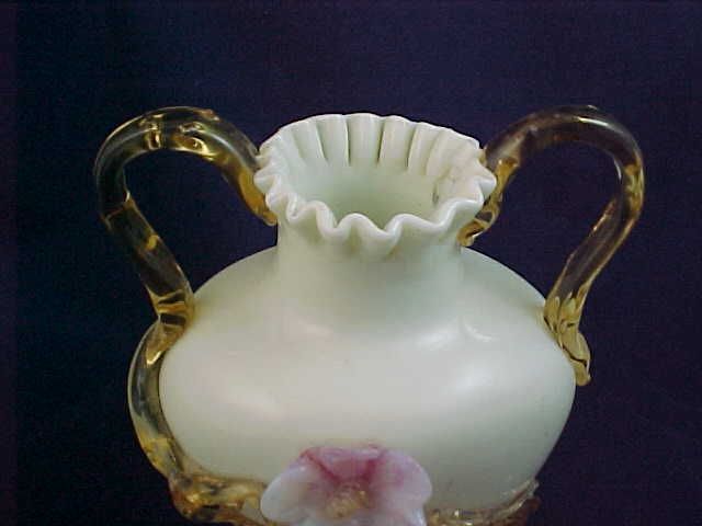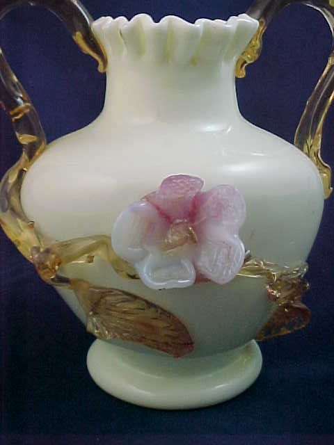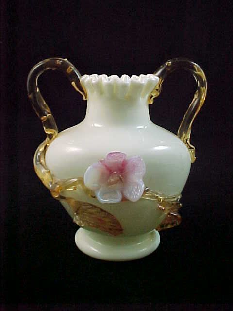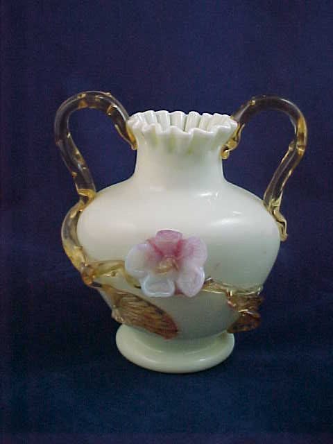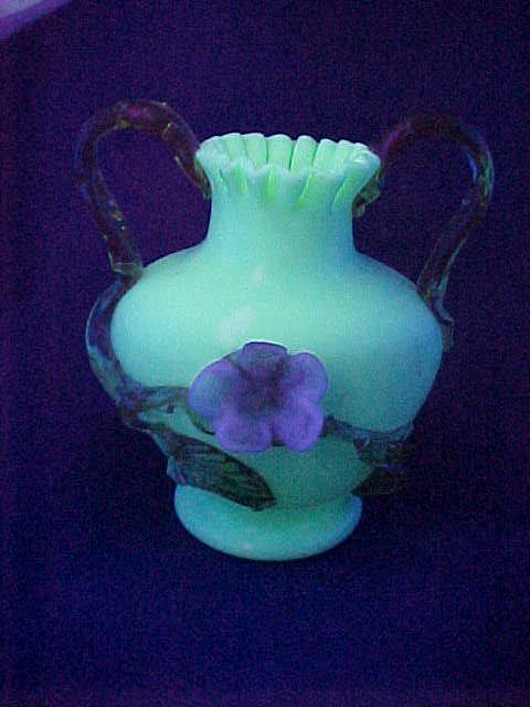 An art glass vase with applied floral rigaree. Flourescent vaseline green under blacklight. approx 7 x 4