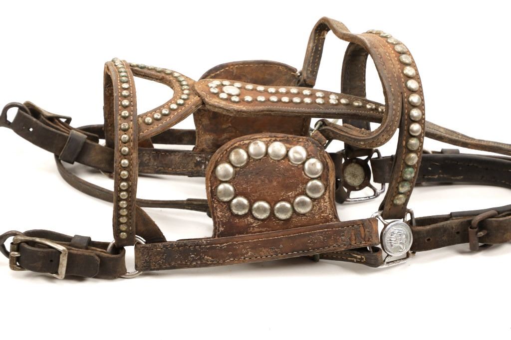 Featured in this lot is this harness leather and studded carriage bridle circa 19th century. The bridle features a wonderfully and professionally crafted leather and brass studded construction that shows thick harness leather that is stitched this a crown connected nose band and shows two eye marker shields to keep the horse on target going in the direction its pointed. The bit shows a single bar short shank construction with half bar decoration to the shank of the bit. The bridle is decorated with a steel or iron adornment of a eagle head. The condition of this carriage bridle is good with some wear and patina to the harness leather and some patina adorning the brass studded nature of the bridle but otherwise shows good overall condition. The measurements of this bridle is 29" x 6 1/2" x 7 1/4.
