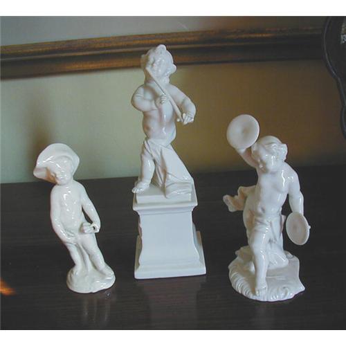 LATE 19TH C.- Three NYMPHENBURG BLANC-DE-CHINE PORCELAIN "PUTTI" FIGURES / One figure on a pedestal base 6 3/4" tall and one figure on a flat base 5" tall.// MINT CONDITION // The 4 1/2" figure with the big hat has a small damage to one hand. These wonderful figures are busy with musical instruments. Each figure marked on base with Nymphenburg marks. <> BURTON BROOK FARM ANTIQUES for the finest decorative items.