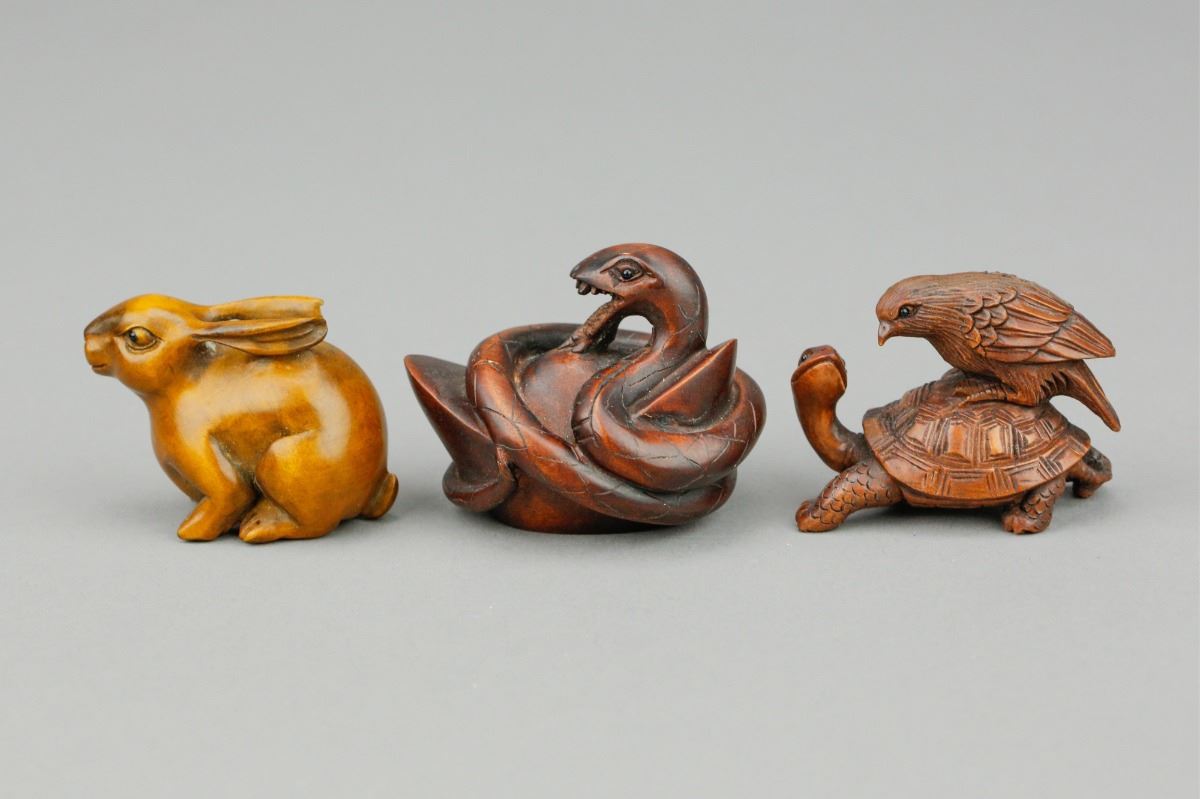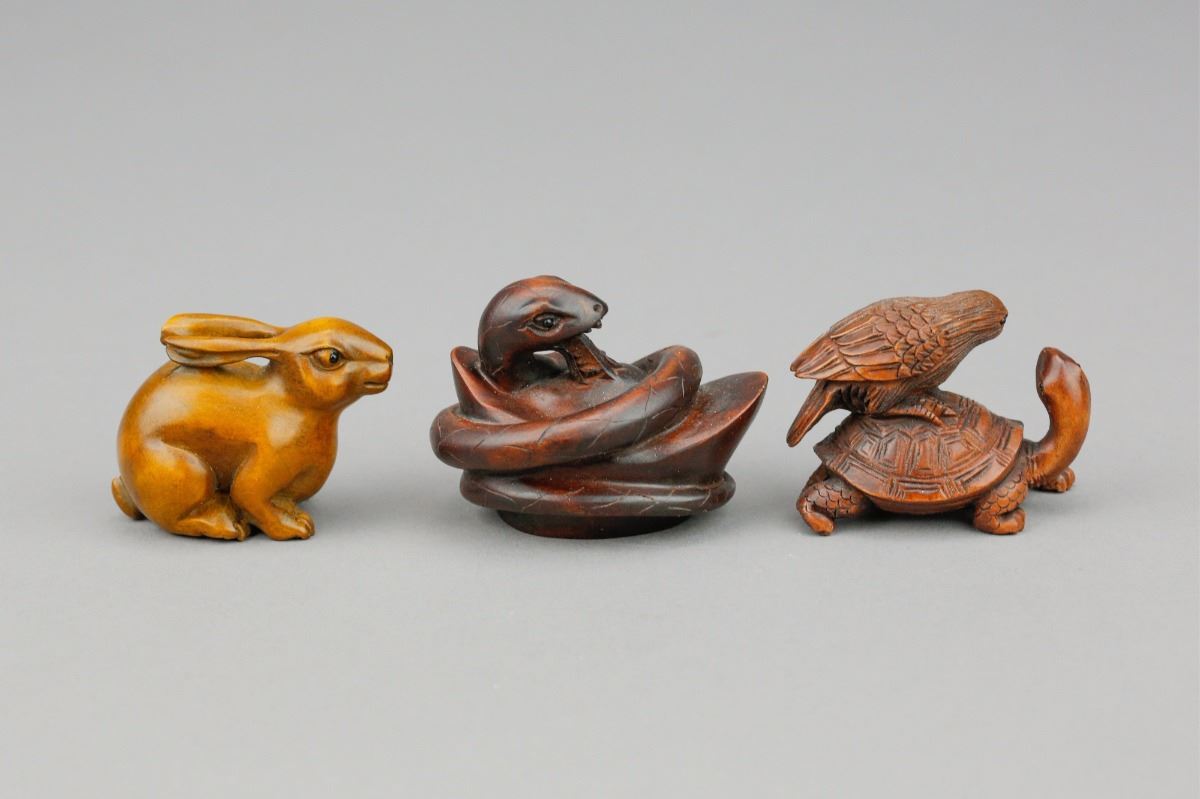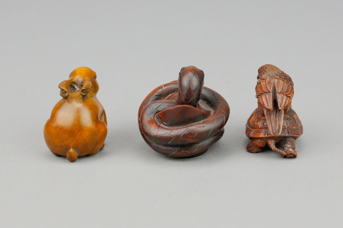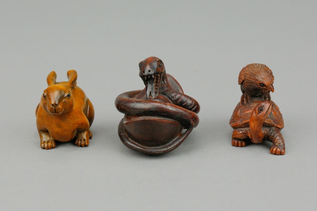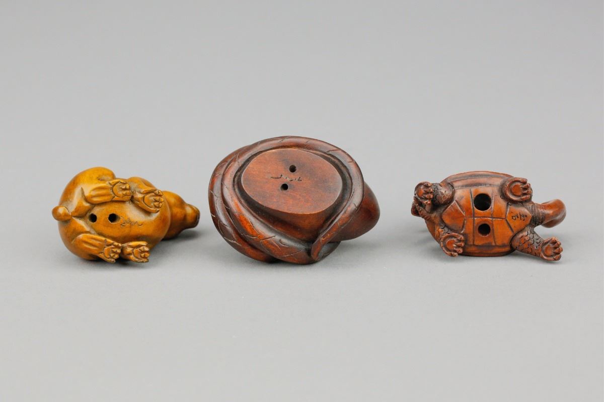 Three pieces of Japanese boxwood netsuke; featuring animals; artist signature on base; pierced for suspension; 19th century; H: 4.5 cm, W: 6 cm, 71 grams total