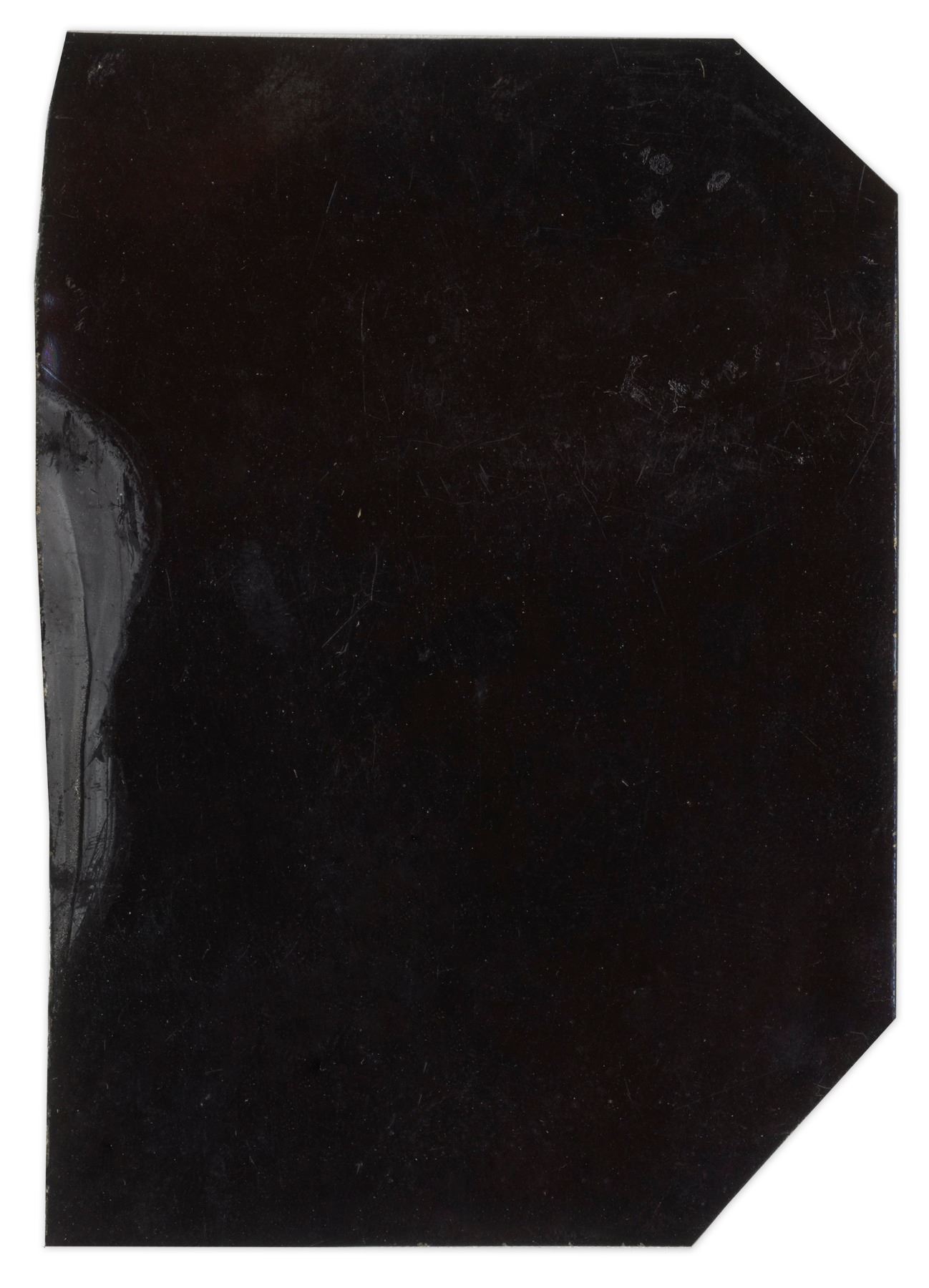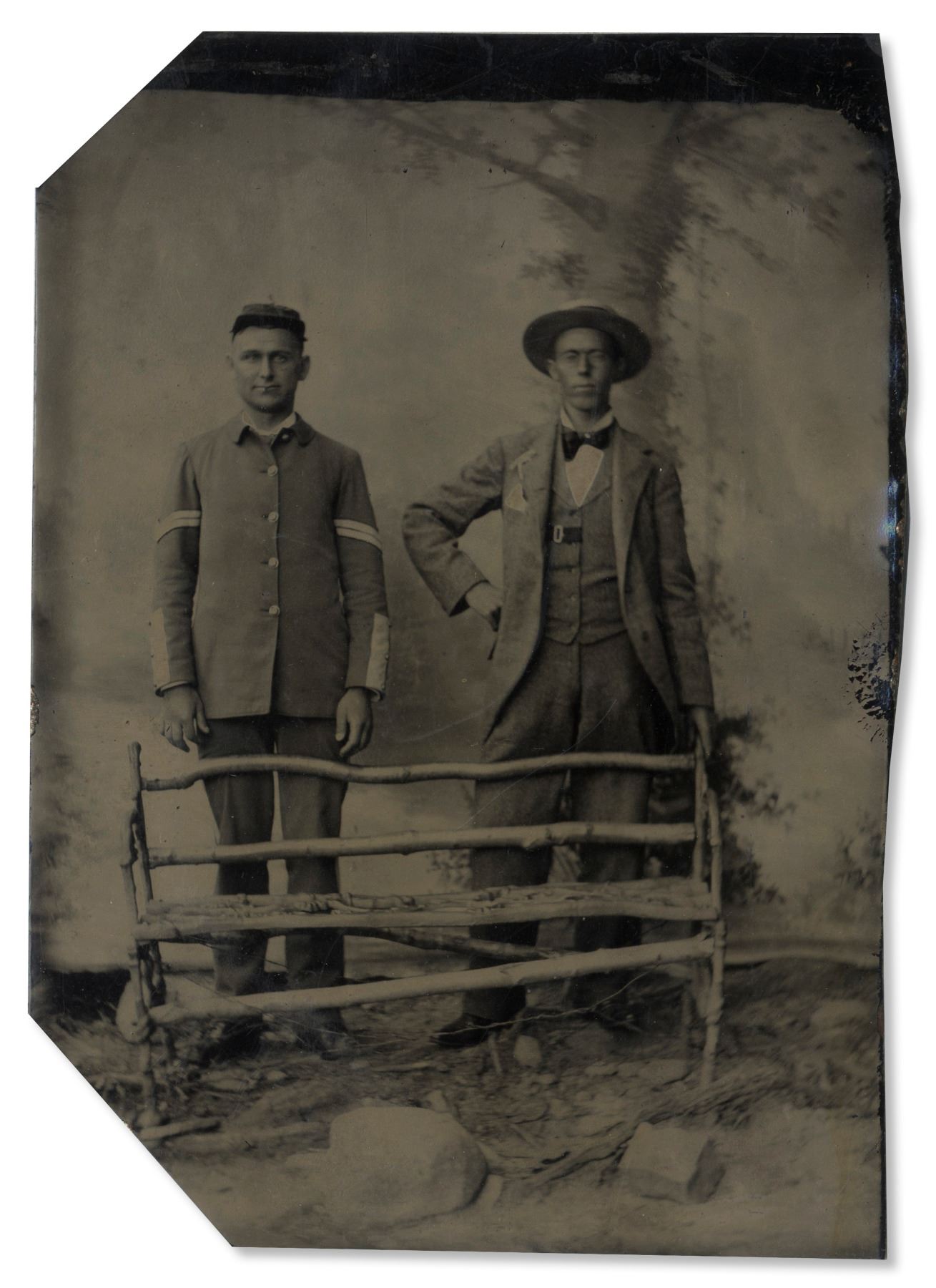 Tintype of two men standing outdoors. The soldier framed left stands erect, fully uniformed with chevron stripes on each coat sleeve and a kepi hat. The man framed right stands more casually, wearing a medal pinned above his coat pocket. He also wears a holster in his vest and a somewhat flippant expression. Image measures 2.5'' x 3.5'' with both left corners clipped. Minor scratches and jagged edges, otherwise an unusual tintype in good condition.
