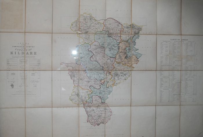 An attractive framed tinted framed map titled "Index to the Townland Survey of the County of Kildare" showing Baronies, Parishes Townlands etc. With inset table of areas.