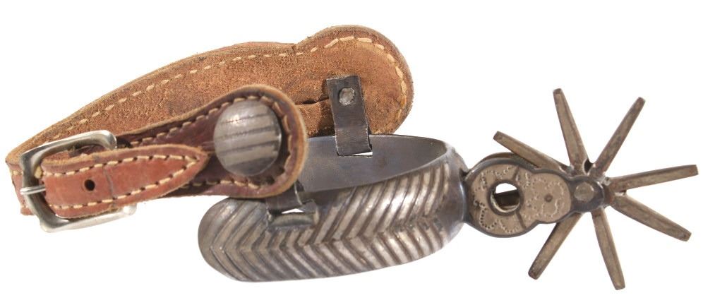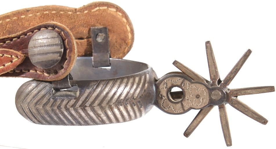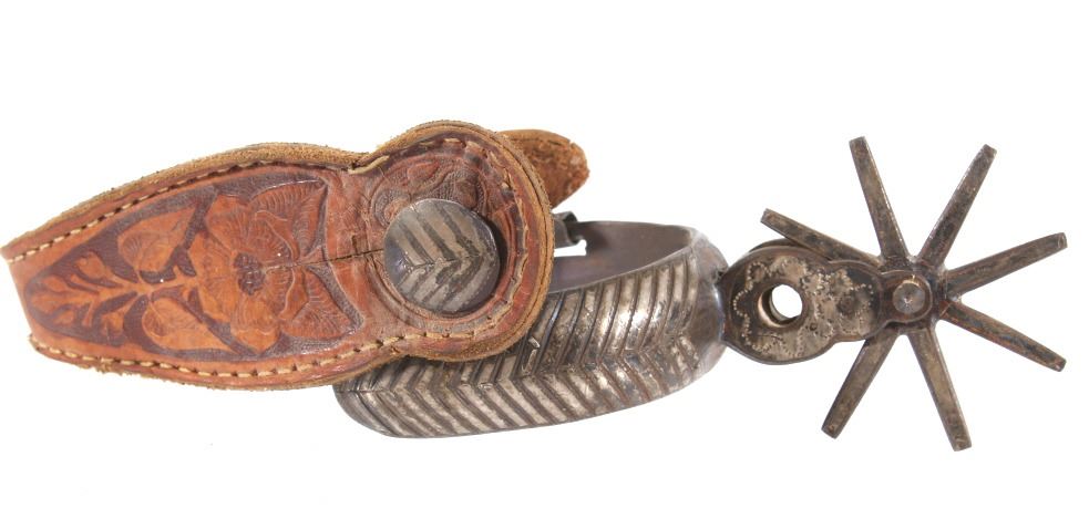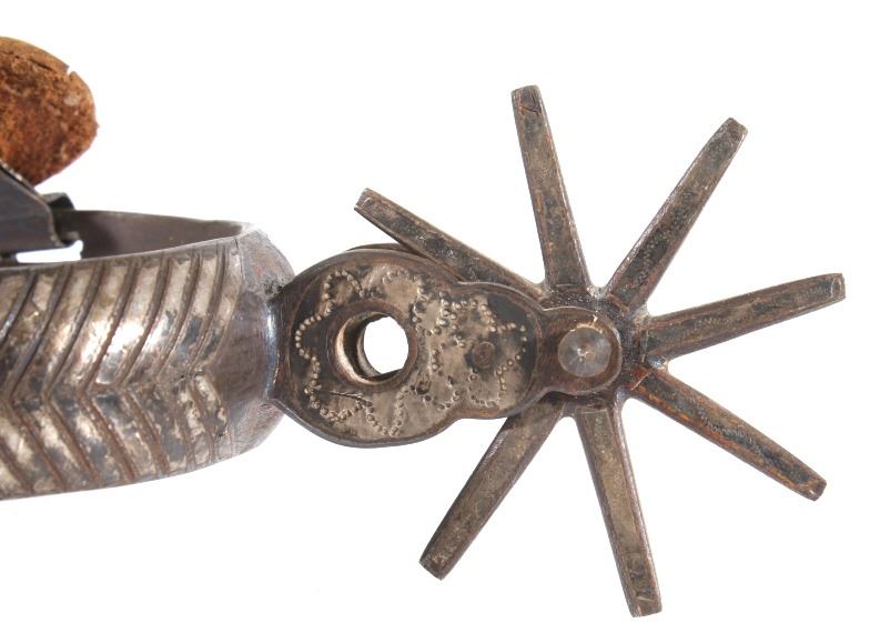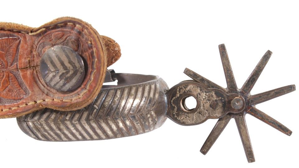 Featured in this lot we have a wonderful set of early Vaquero spurs showing a double-mounted silver and heavy iron construction and originating from the late 1800's. These spurs display wonderful eight point silver sided rowels, ornate silver double-mounting, and tooled leather straps originating from the 1950's. The spurs originate from the 19th Century to early 20th Century and are truly a wonderful representation of early Mexican Vaquero Cowboy spurs. The shank shows a figure-eight coiled rattle snake design with double-mounted etched silver holding the eight-point beveled rowels. Each side of the spur shows a double-silver mounted Chevron design with arrow like parallel lines. The spurs show good condition overall with more modern straps and a warp patina across most of the silver. The spurs themselves measure 6" long by 3 5/8" wide with a 2 3/4" rowel.