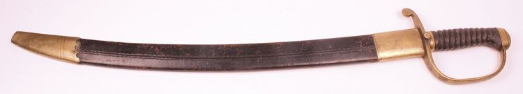 Sword used by British Police including the Royal Irish Constabulary. With brass knuckle guard, fish-skin grip, curved fullered blade and brass mounted leather scabbard.