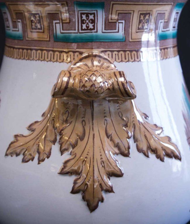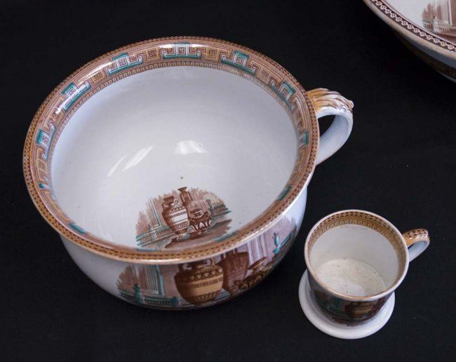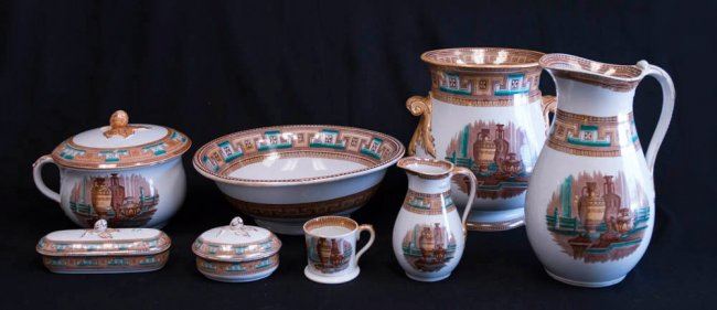 Grecian scenes. Including large pitcher and bowl; covered soap dish; small pitcher and mug; covered thunder jar; pot and jar. 8 pieces total. Small line in jar.