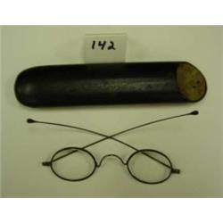 19th Century wire-rim spectacles in early composition hard case (possibly gutta percha). Gold tooled design. Lenses intact. Glasses are 4.25" across. Case is 6". Condition: Very Good, gold faded