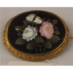 19th Century oval brooch set floral pietra dura panel within a gilt metal mount, the reverse with...