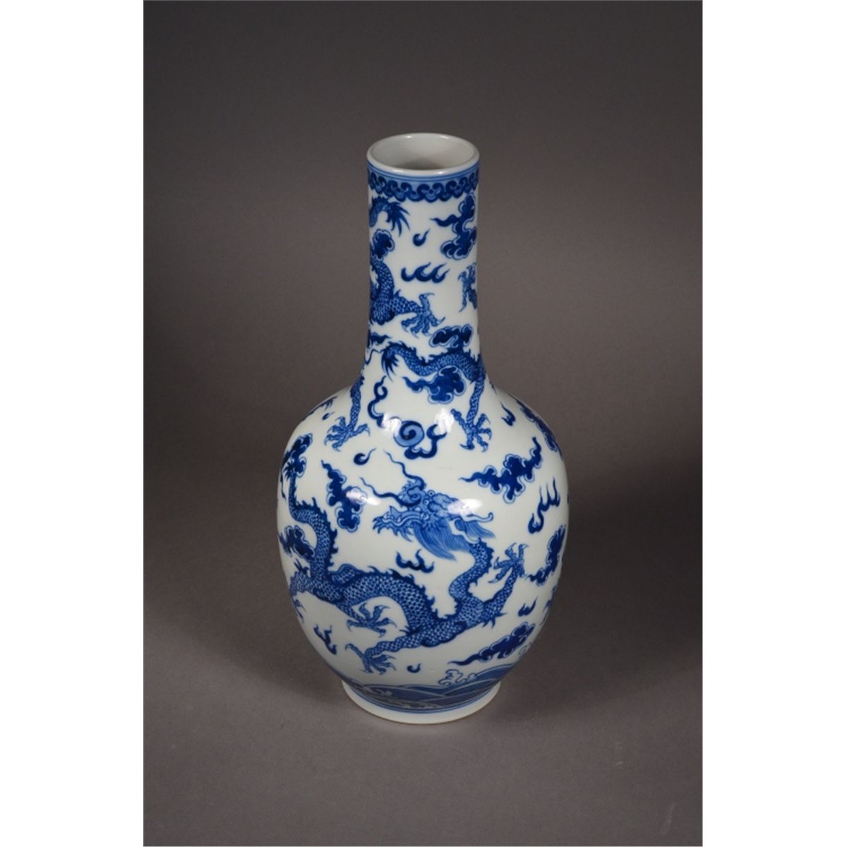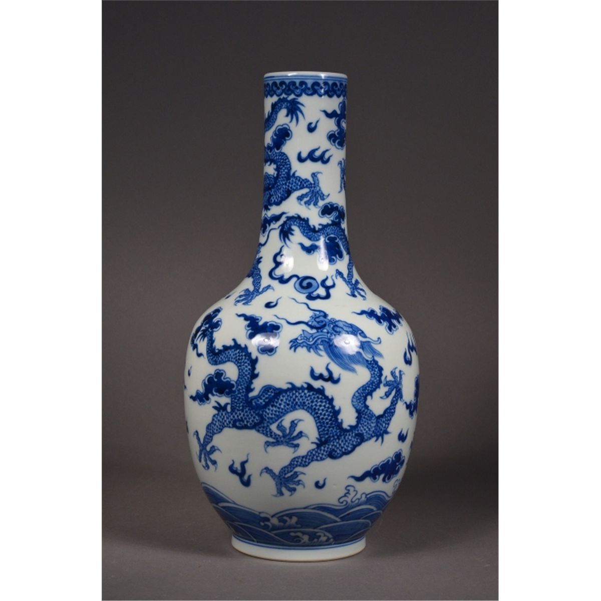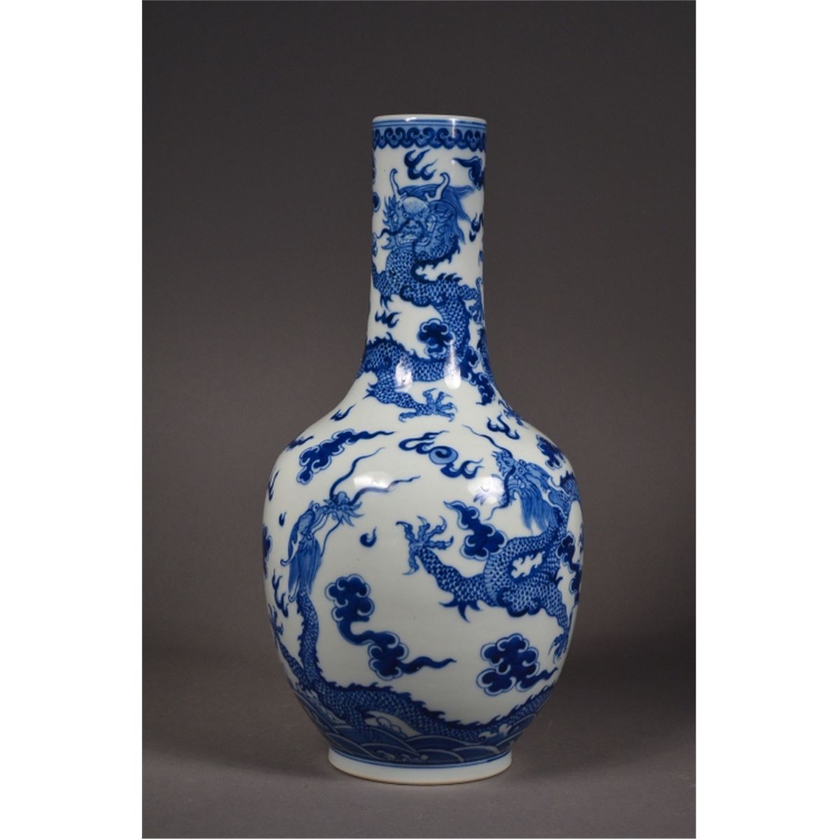 Fine 19th Chinese blue and white porcelain stick vase: depicting four five-toed dragons chasing flaming pearl; six-character Jiaqing mark; 13 1/2" tall, 6 1/2" diameter