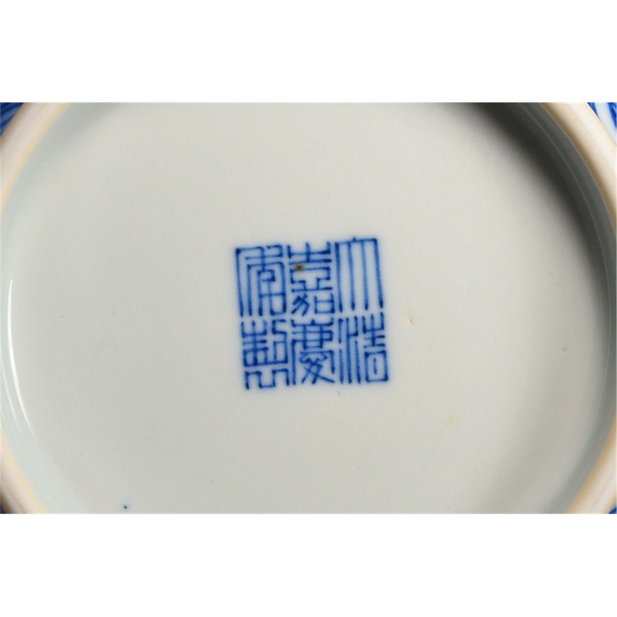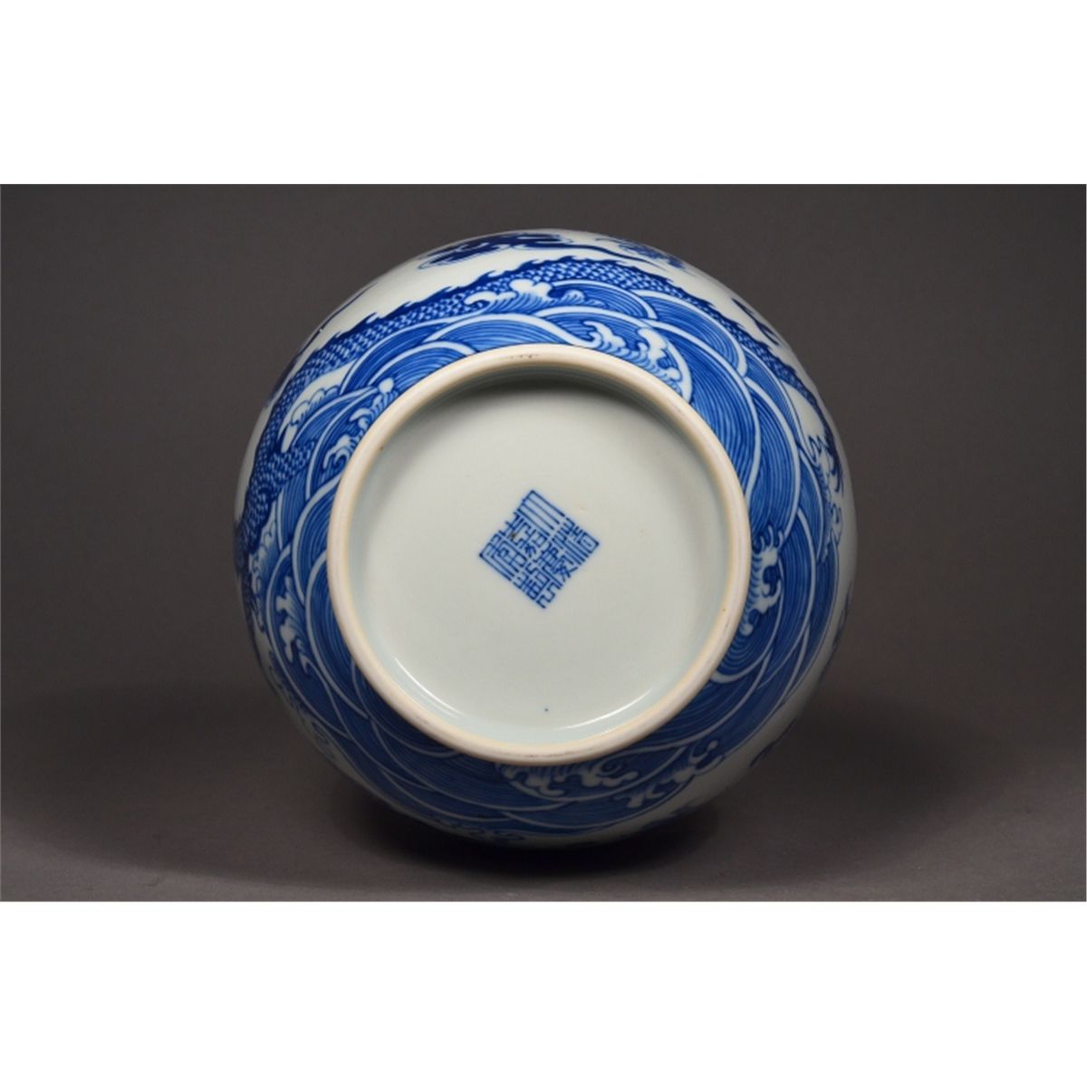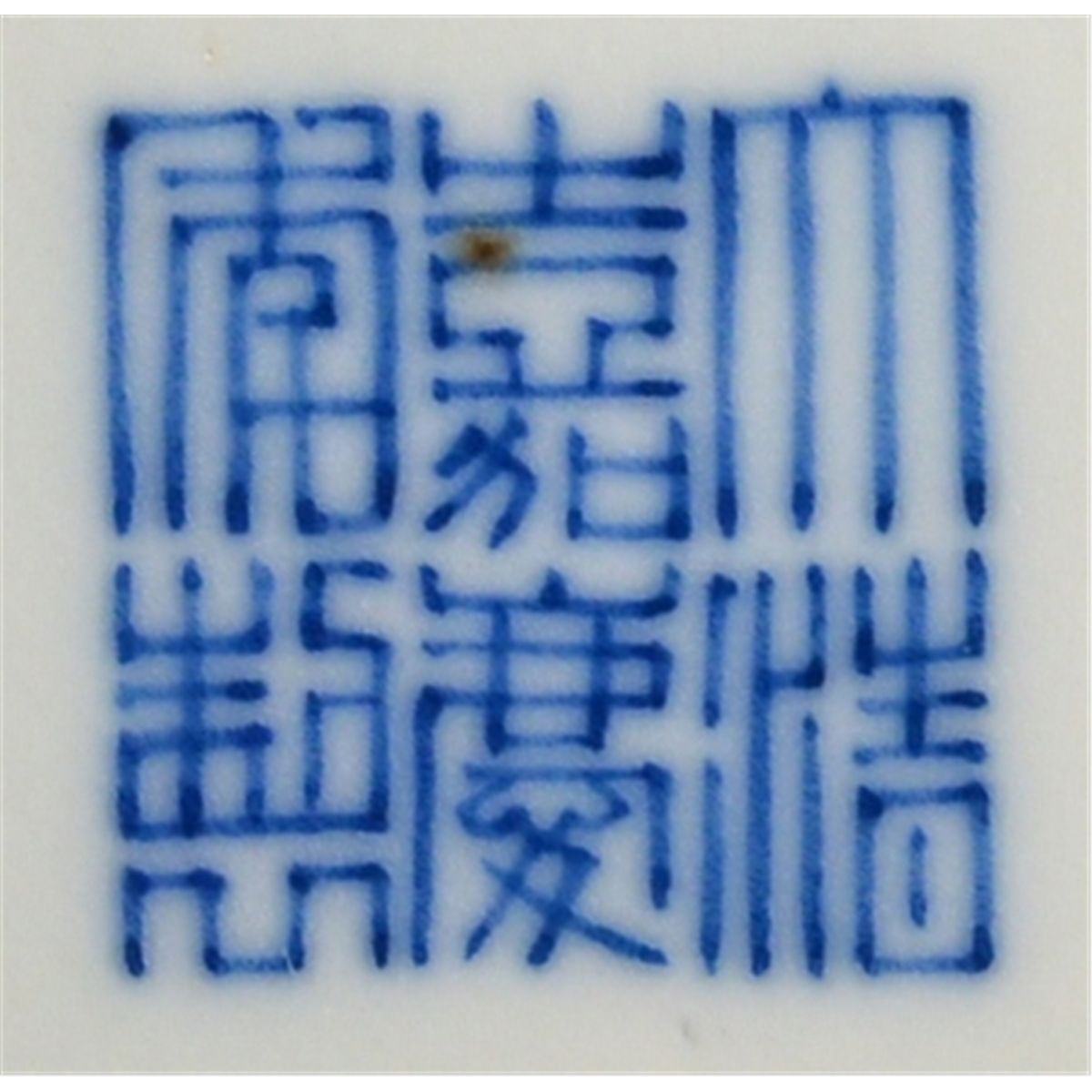 Fine 19th Chinese blue and white porcelain stick vase: depicting four five-toed dragons chasing flaming pearl; six-character Jiaqing mark; 13 1/2" tall, 6 1/2" diameter