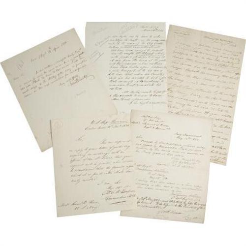 <B>Lot of 19th Letters and Documents With Naval Themes.</B></I> An interesting lot of mid-19th century letters featuring a one page letter dated January 21, 1831, written from the U.S. ship Guerriere by Commodore C. B. Thompson, concerning an exchange of officer's with the U.S. ship St. Louis “<I>your request will be granted, when it is ascertained that the grounds upon which it is predicated shall have really existed</B></I>”, toned with the usual fold creases, else very good; one page of Navy orders dated May 14, 1853, instructing an officer to proceed to Philadelphia for examination before a board of inquiry, with several endorsements, toned with the usual fold creases, else very good; a one page letter, dated April 12, 1818, from James Pleasants, Jr., United States Representative from Virginia, to the Secretary of the Navy, Benjamin W. Crowninfield, recommending Richard Watkins of Chesterfield County, Virginia for nomination to midshipman, toned with the usual fold creases, else very good; a one page letter dated March 3, 1835 from a Mr. Peyton to Commodore Isaac Hull, thanking him for the gift of a cane made from wood of the ship Constitution; toned with the usual fold creases, else very good; and a three page letter from Allen McLane of Delaware to a General Green requesting ammunition for ship's cannons, paper toned with the usual fold creases, else very good. <I>Ex. Henry E. Luhrs Collection.</B></I> <BR><BR><b>Shipping:</b> Flat Material, Small (<a target="_blank" href="http://www.heritageauctions.com/common/shipping.php">view shipping information</a>)
