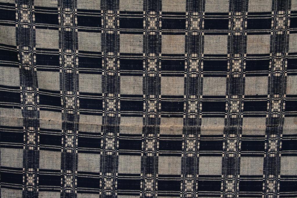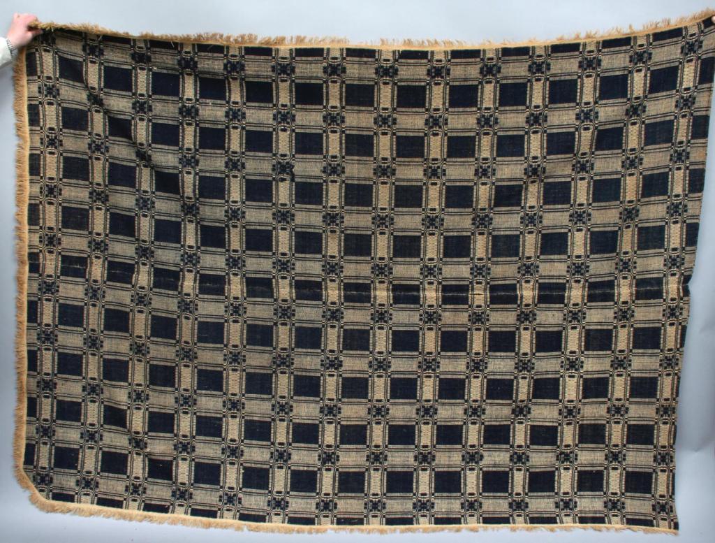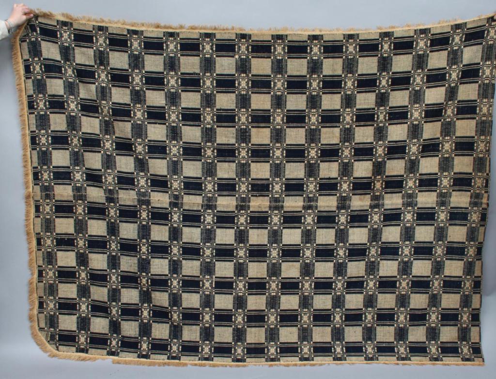 Woven in cream and navy with a geometric motif, three sides with fringe, unsiged. 92" x 67 1/2". Condition: good, some light wear.