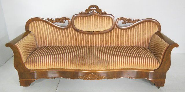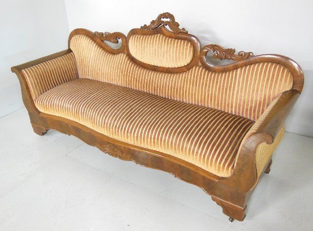 Striped velvet upholstery. Approx. 80" across, seat 67" x 18", 17" H seat, 40" H back.