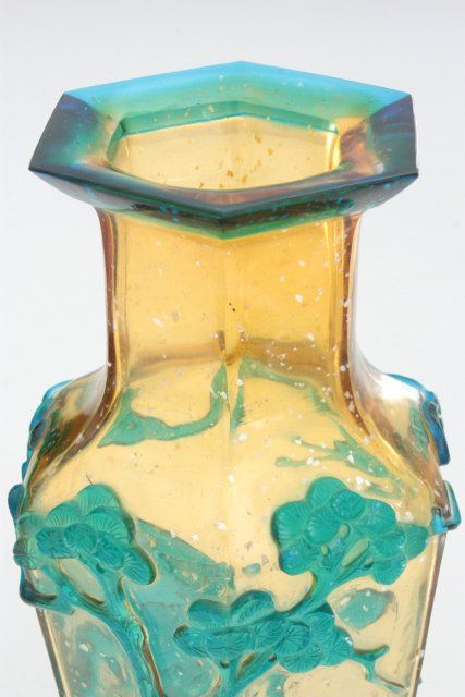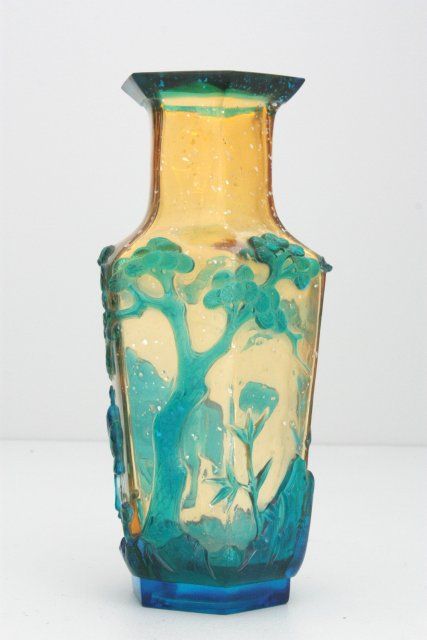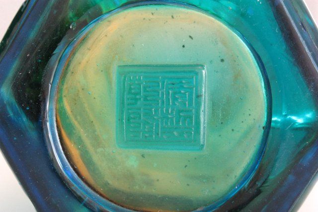 Blue, green & amber glass, depicting "Landscape & Man on Horse", with Qianlong mark. Approx. 9.5" H. Please read our terms of sale.