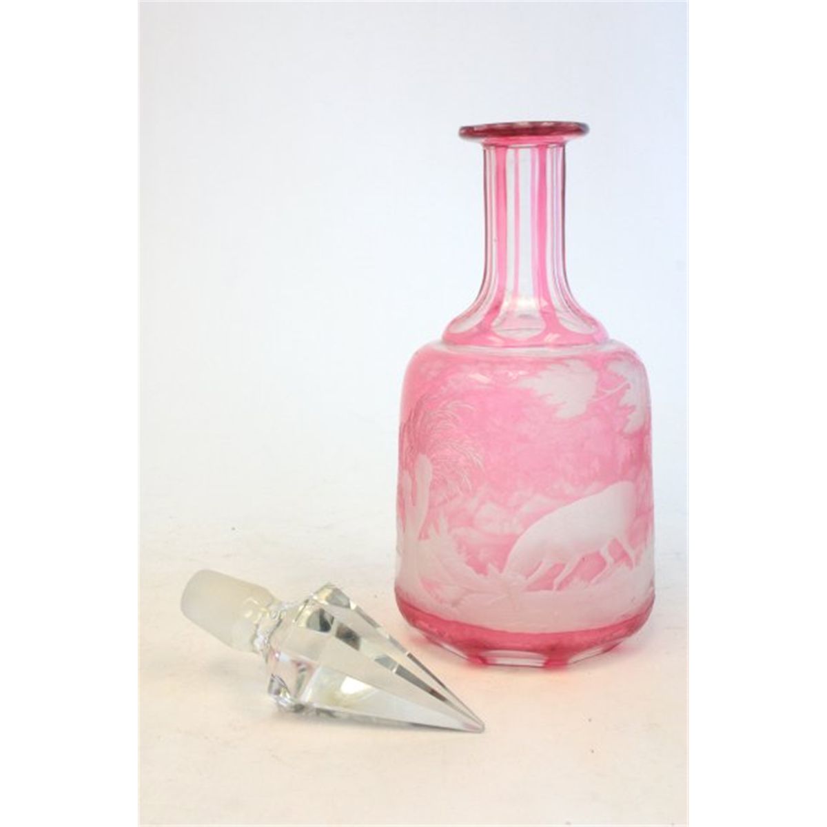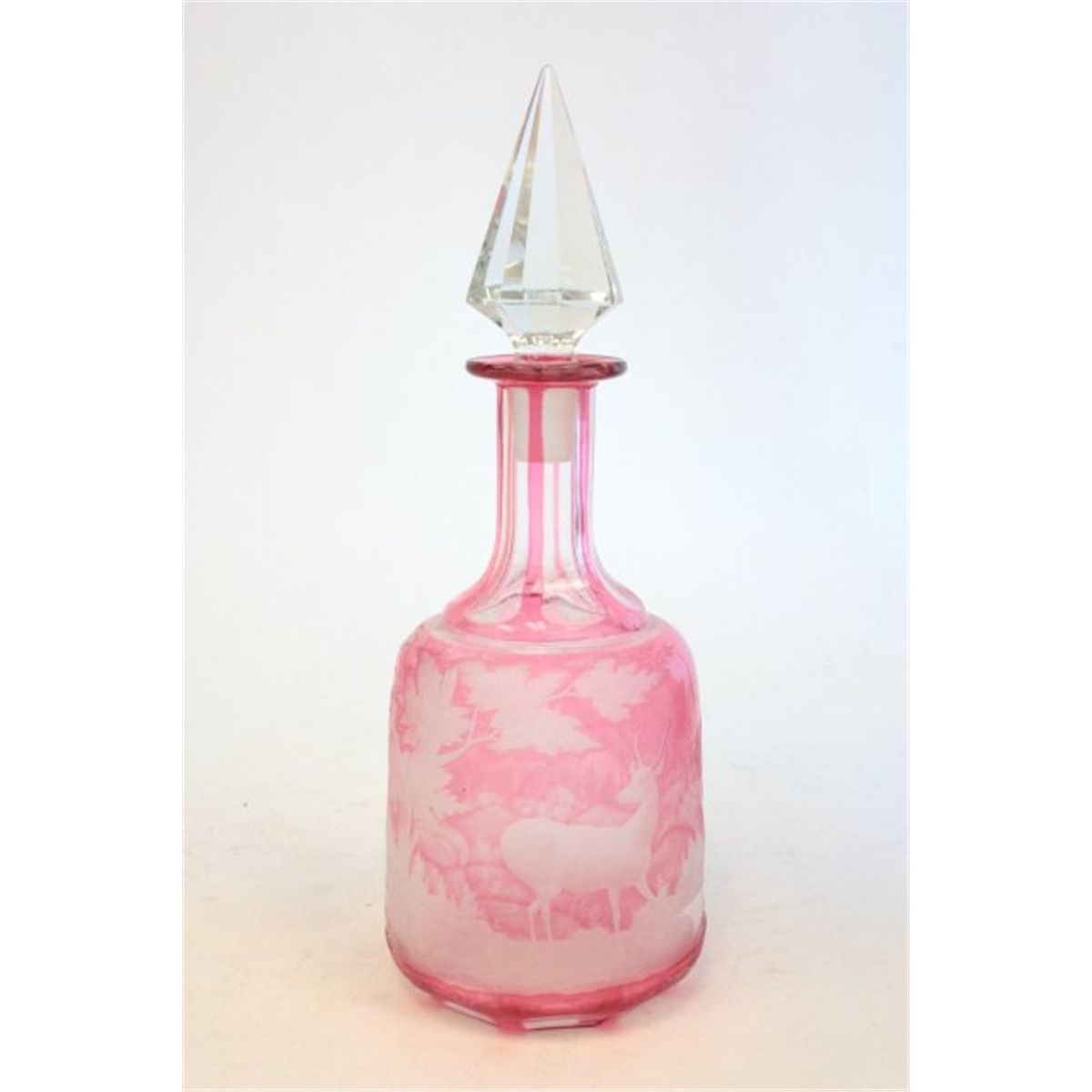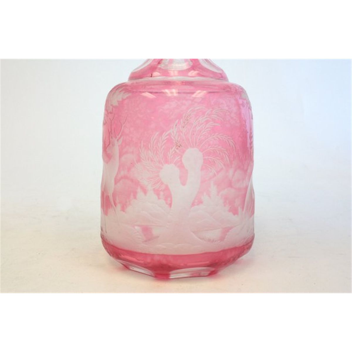 Pink, beautifully engraved deer in woodlands setting, no flaws, excellent condition. Approx. 11.5" H. Please read our terms of sale.