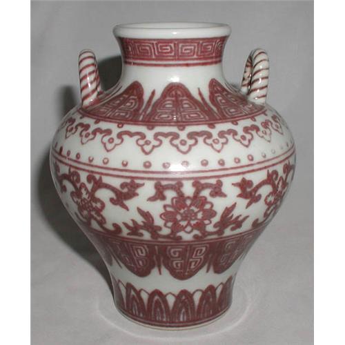 Very good 19th c. Chinese overglazed red small pot with archaic shape and decorative pattern, marked on the bottom.