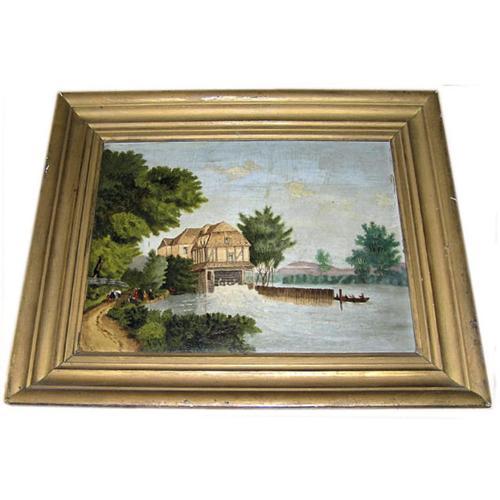 This 19th century French oil on artist board is an exceptional example of folk art. Unsigned and unattributed. Depicted in this genre scene is a small river, a working mill, with ladies walking along the banks and gentlemen in a rowboat. Board measures 12.5" by 16" and frame measures17" by 10.5". " Board comes from Muller of Paris as noted by the stamp on the rear. Period frame. Some degree of craquelure throughout but mostly noticeable in the top third of the painting.