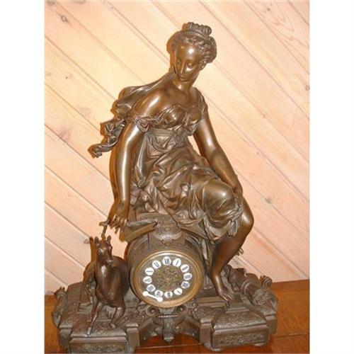 The detail in this 19th c. French spelter clock of Diana the Huntress is amazing. Just look at the way her dress is laying against her body. Note the fine workmanship on the base. It has an original antique patina. Time & Strike