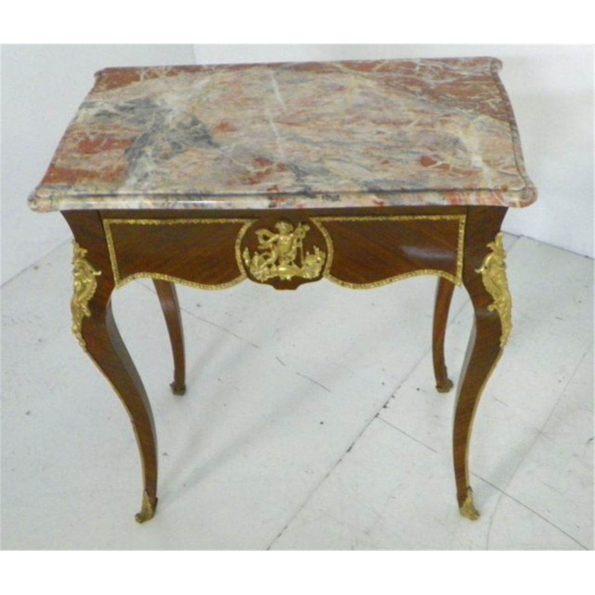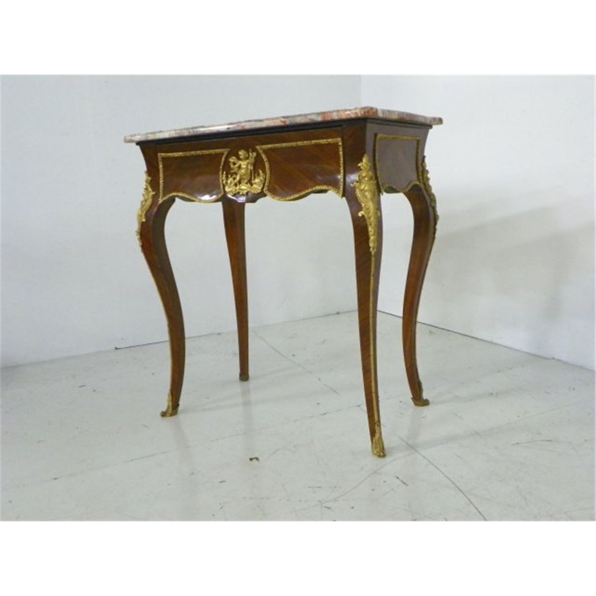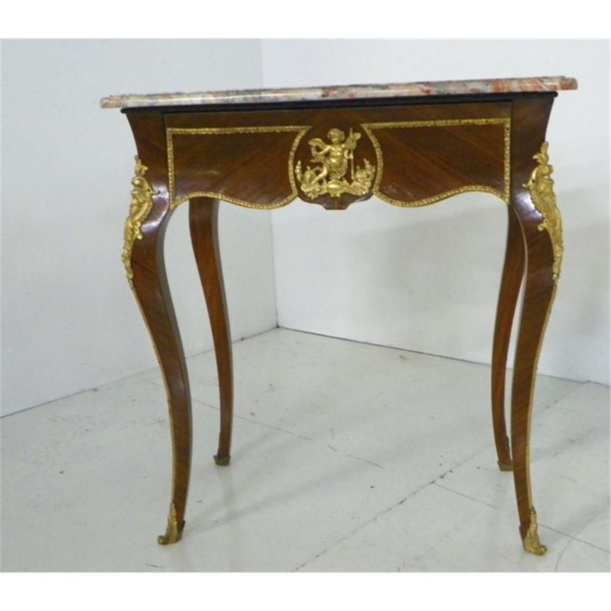 Cherub bronze ormolu mounted. Veneered side table with one drawer. Approx. 30" H, marble top approx. 28" x 17" Please read our terms of sale.