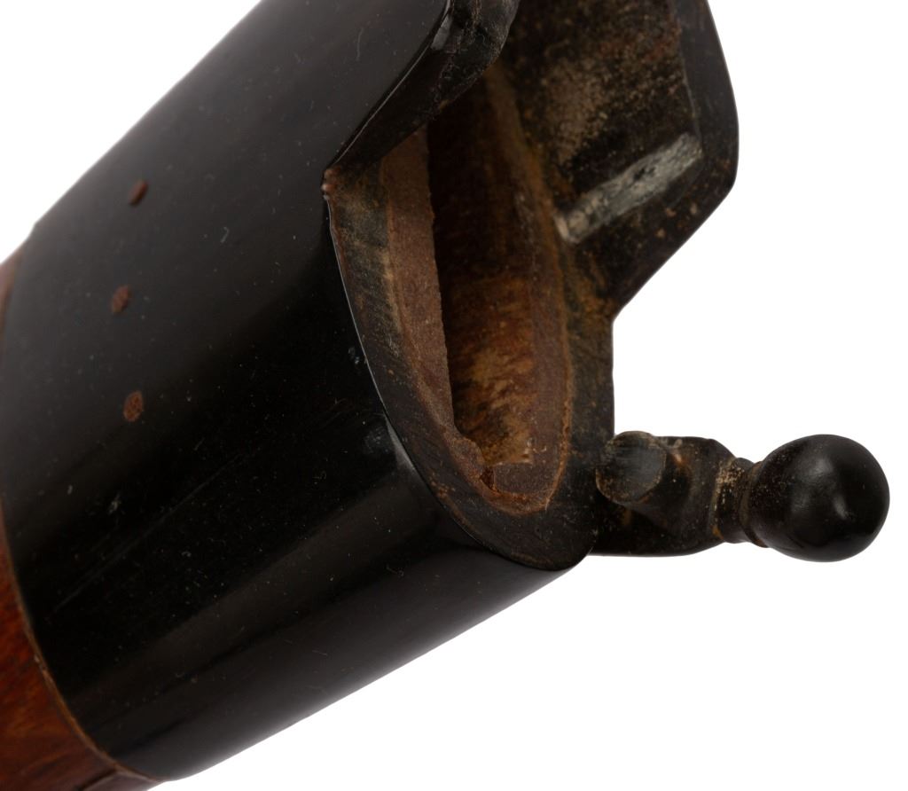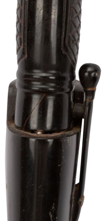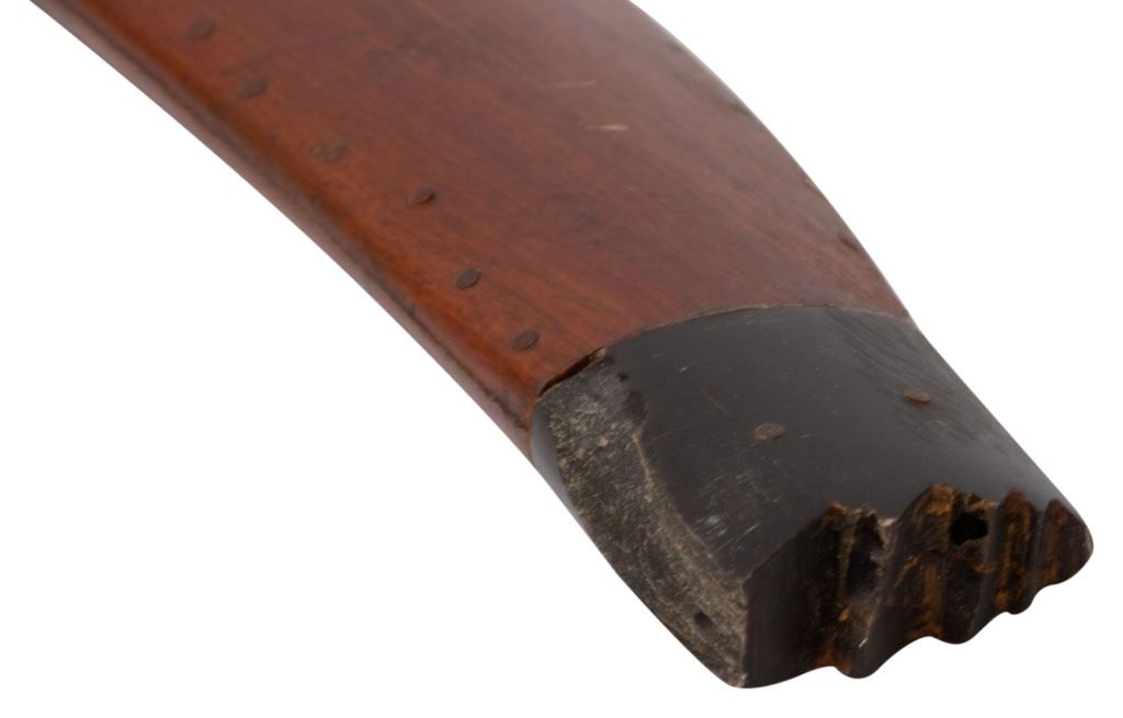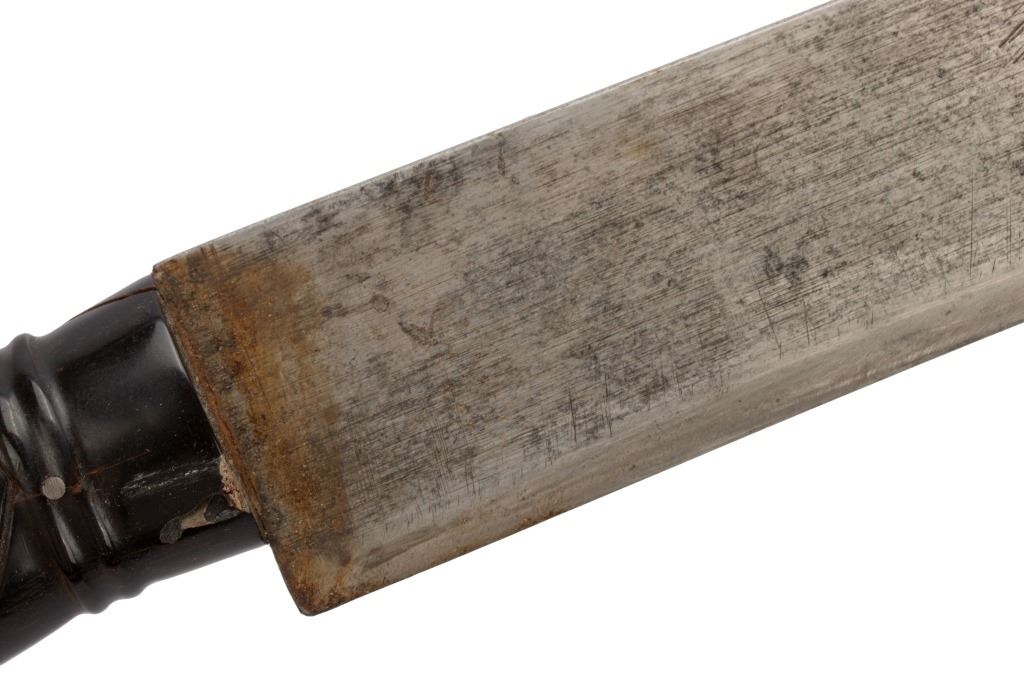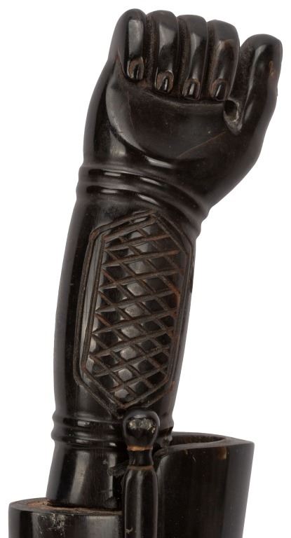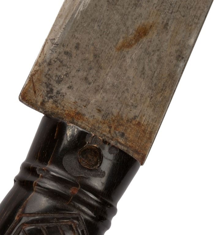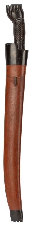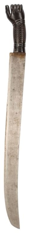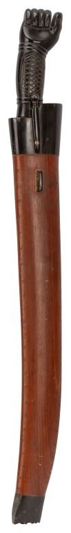 Item/Description: Parang short sword / machete with bone grip carved to form a fisted hand. Wood and horn scabbard. (Golok, Machete, Knife, Binagong style blade, Betawi, Sudanese)