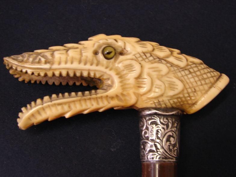 19th C Waling Stick with Ivory Finial, Beautifully Carved handle by master artist, in the Shape of a Dragon silver collar