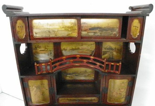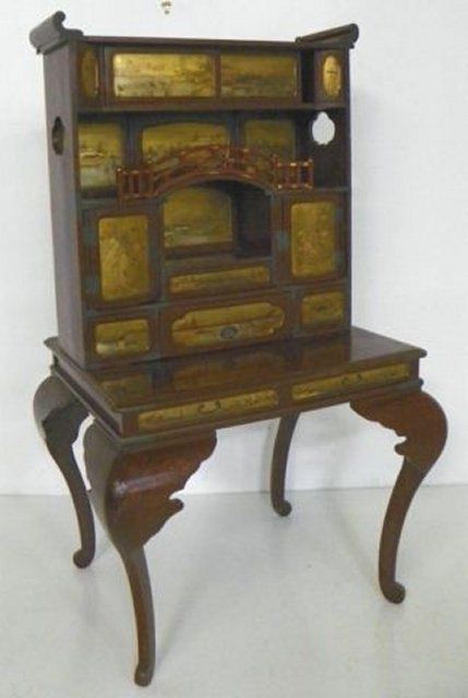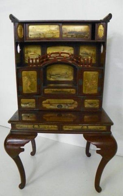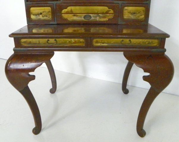 With paneled superstructure, sliding doors above an open section with central bridge above dome, top cubby hole flanked by two cupboard doors above a shallow drawer. All mounted above frieze with two square front drawers, two long drawers,