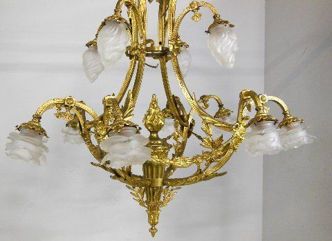 Converted gas chandelier, with lalique style shades. 12 light with 8 shades in a "Rose" design and 4 in a "Flame" design. Torch middle flanked by a swag design and figural heads. Rams heads on top of chandelier and bow design in middle. Approx. 39" Diameter.