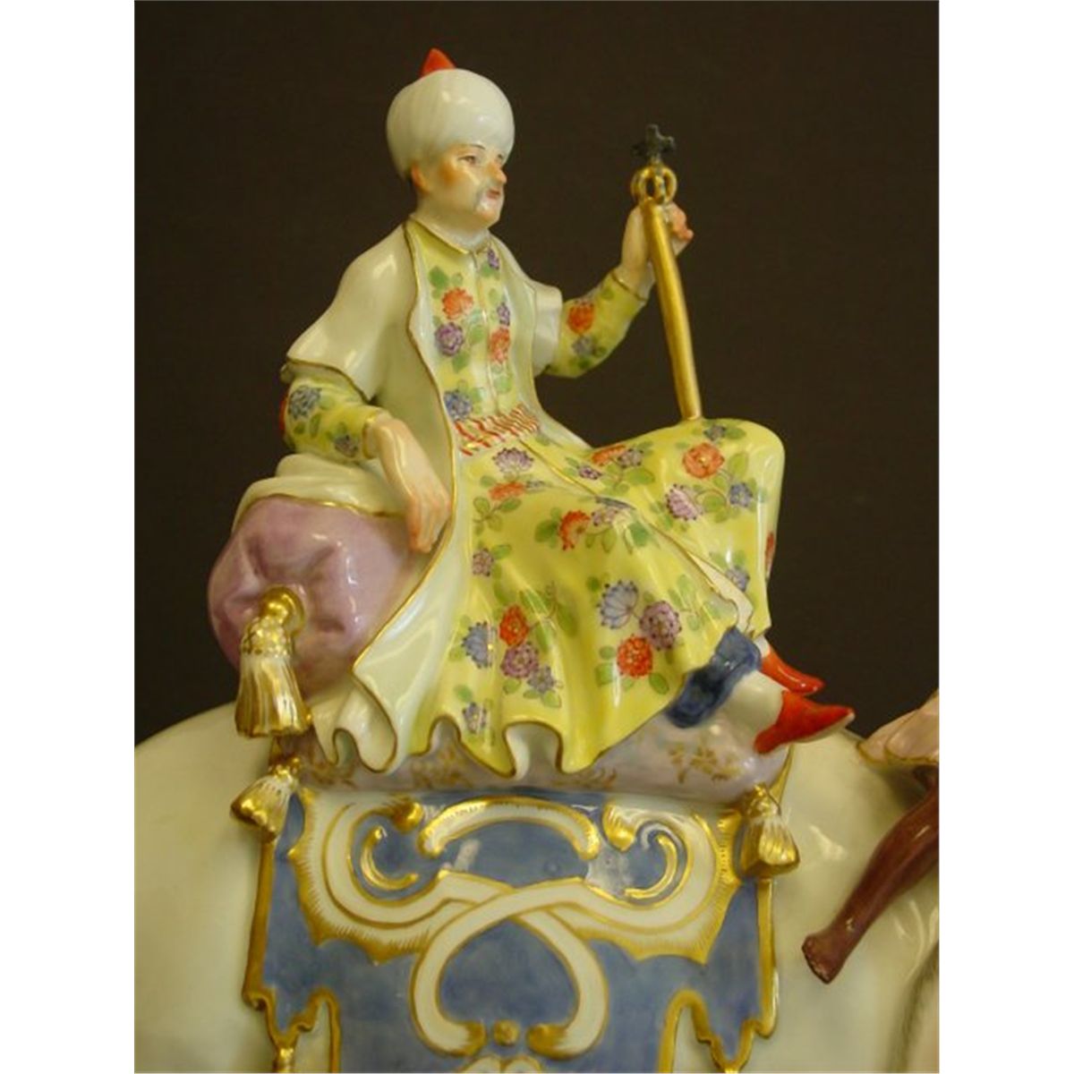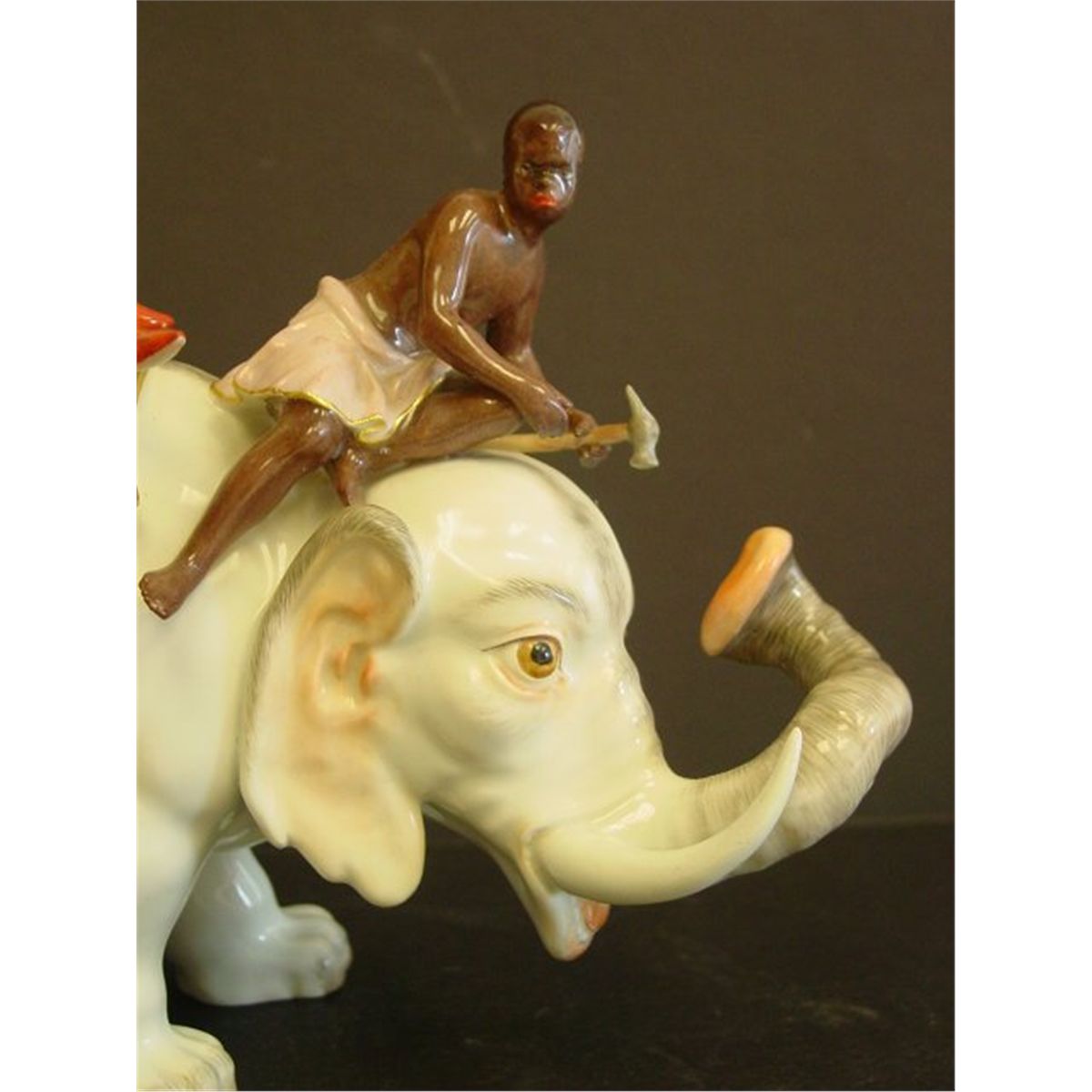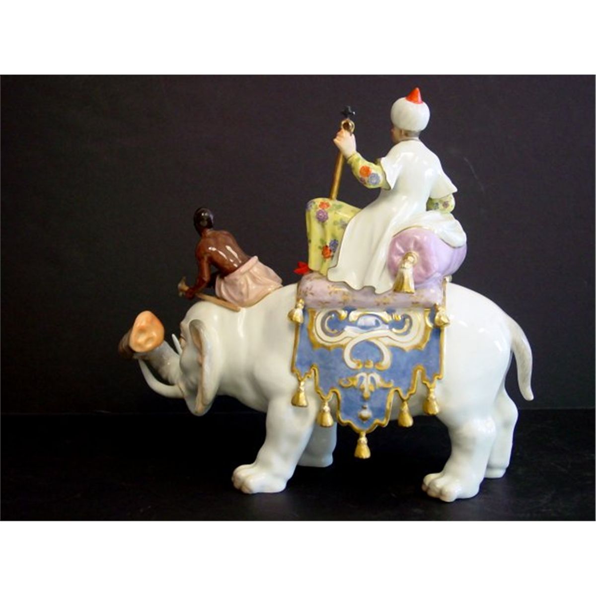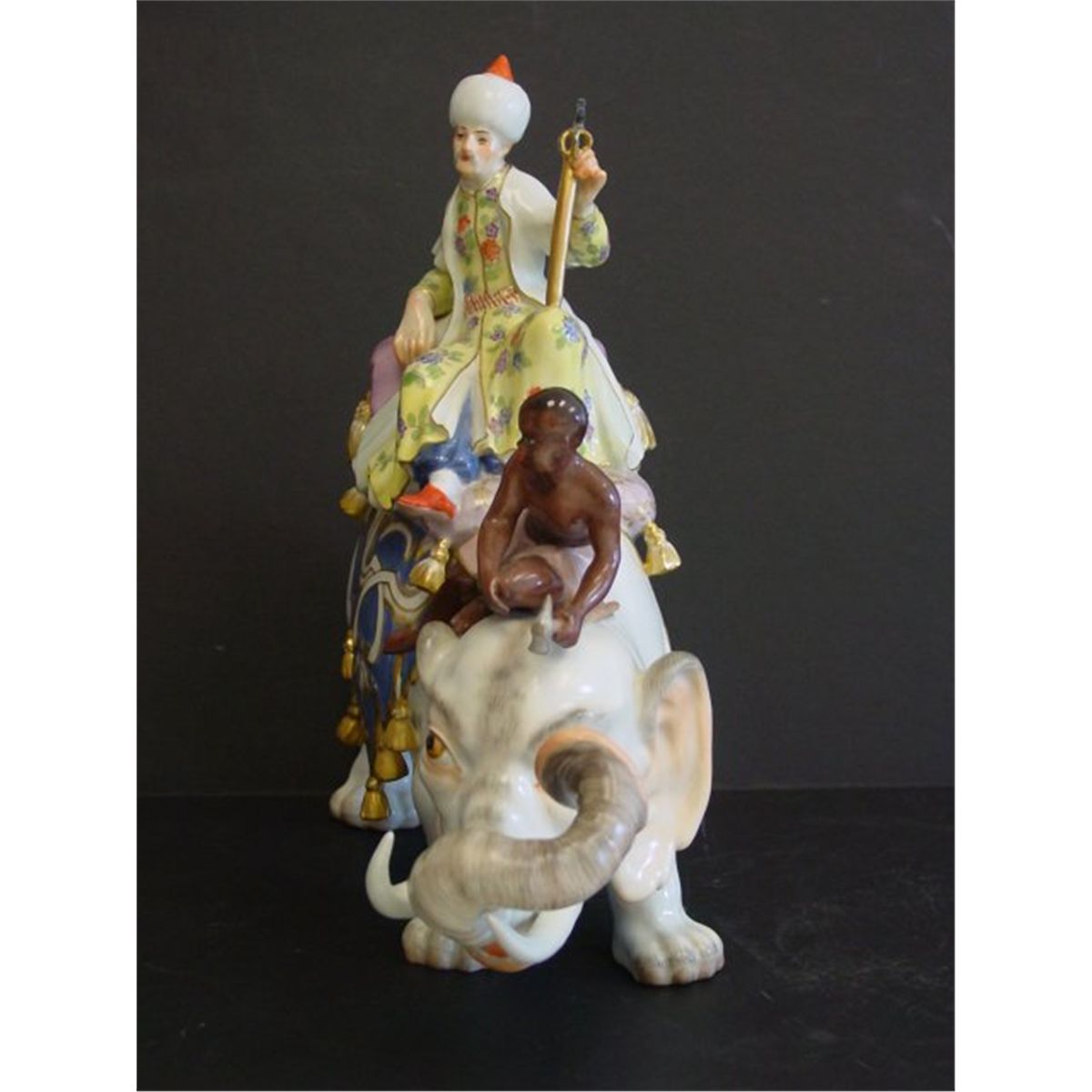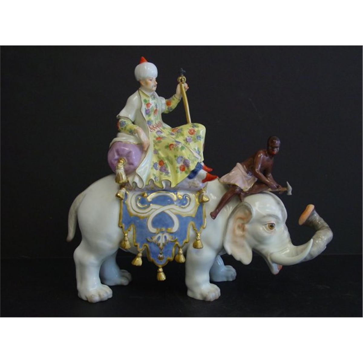 "Persian Nobleman Riding Elephant with Moor", wonderful example of this great model by Kaendler & Reiniche, great color in the glaze, the orb on the end of the staff has long ago been restored otherwise no flaws or restoration, excellent
