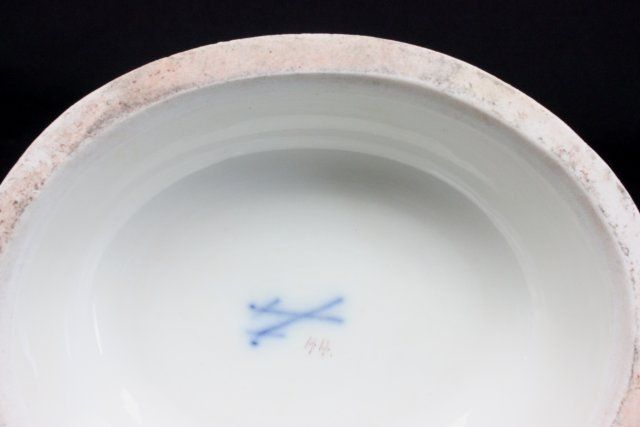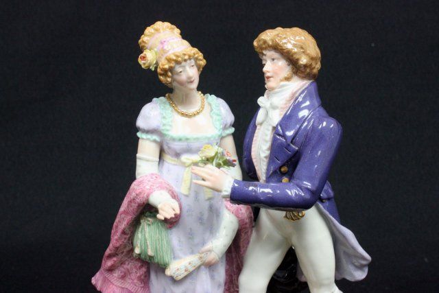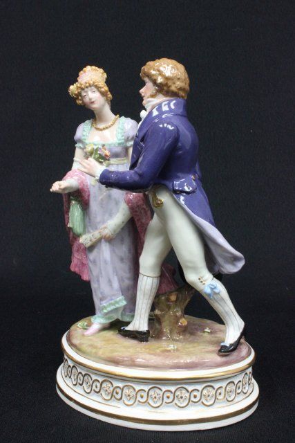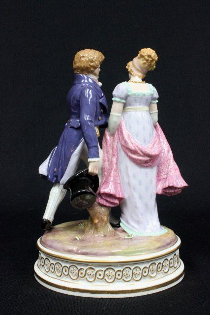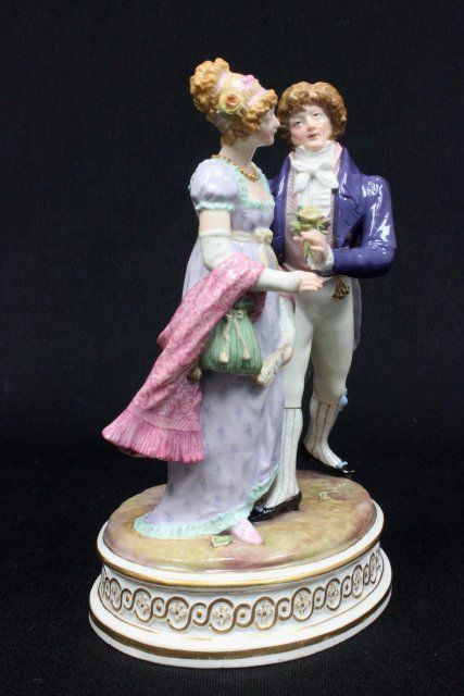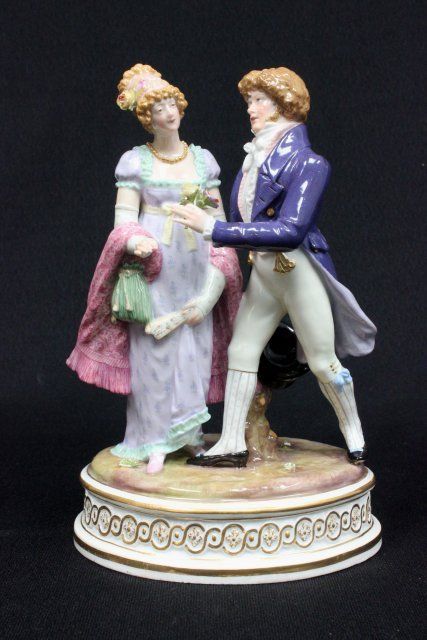"Courting Scene", incised mark #44, blue cross sword mark. Approx. 7.5" H. The property of a NYC gentleman's 20 year collection. Possible professional restorations.
