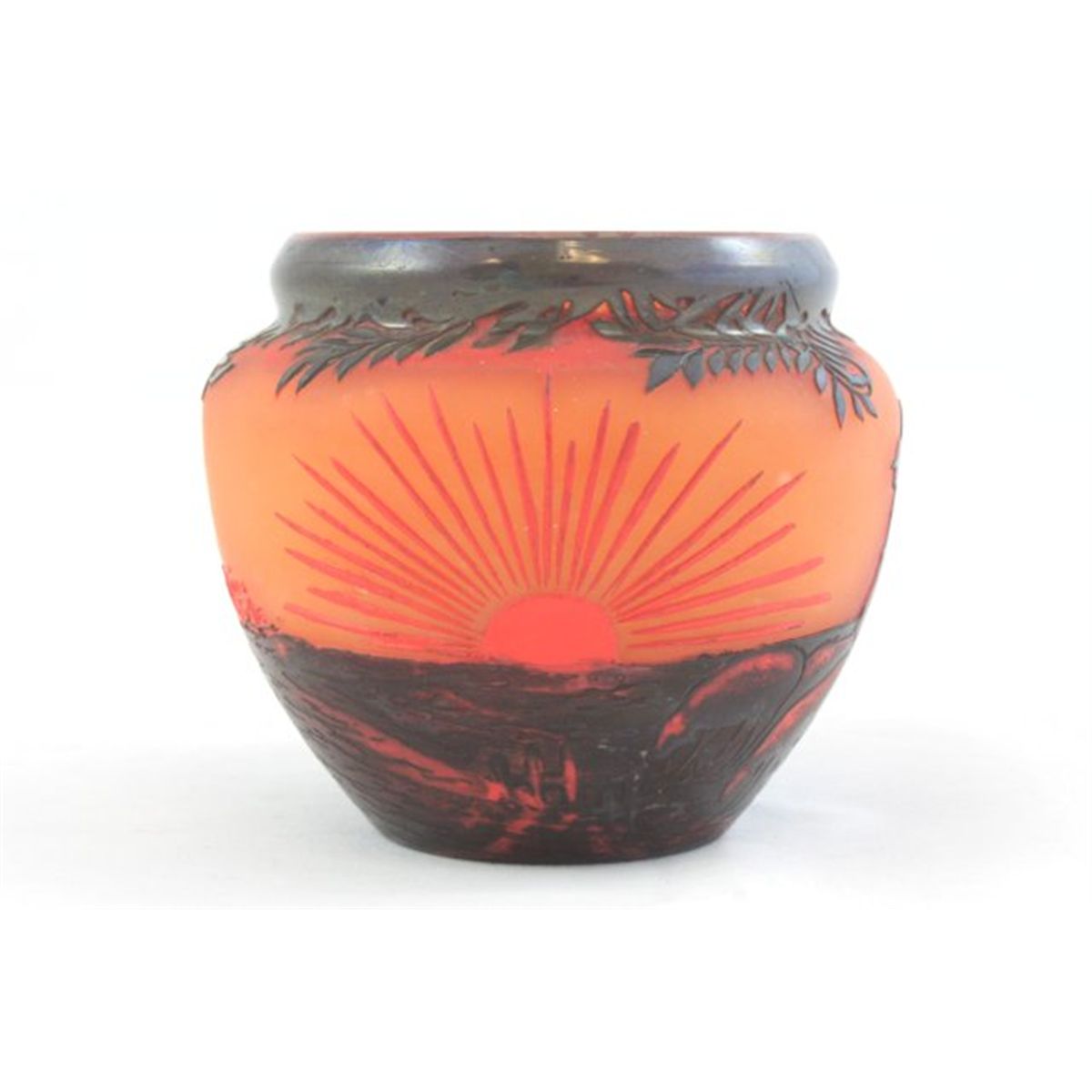 Deeply cut cameo design with fabulous colors, signed in cameo Muller Fres Luneville, ca. 1900. Appprox. 4" x 4.5". Please read our terms of sale.