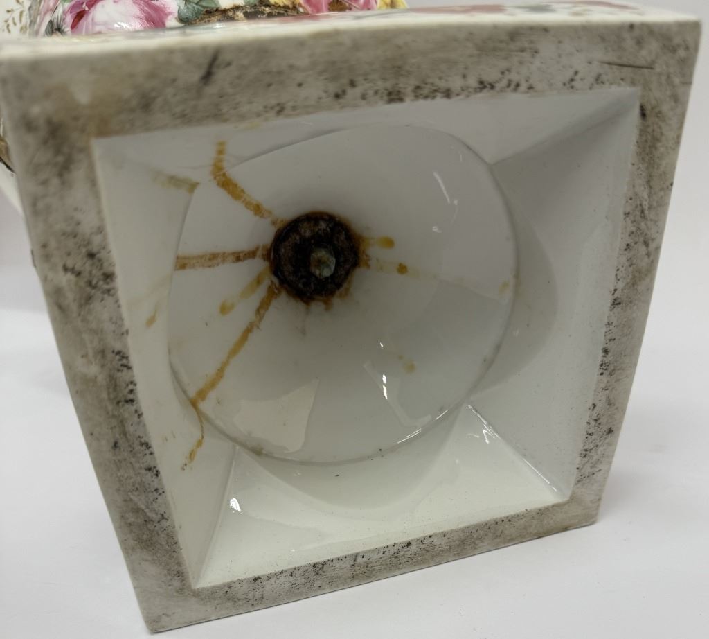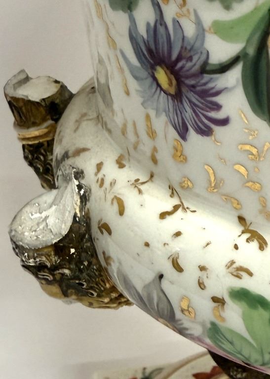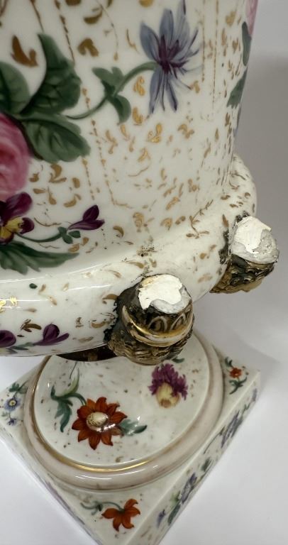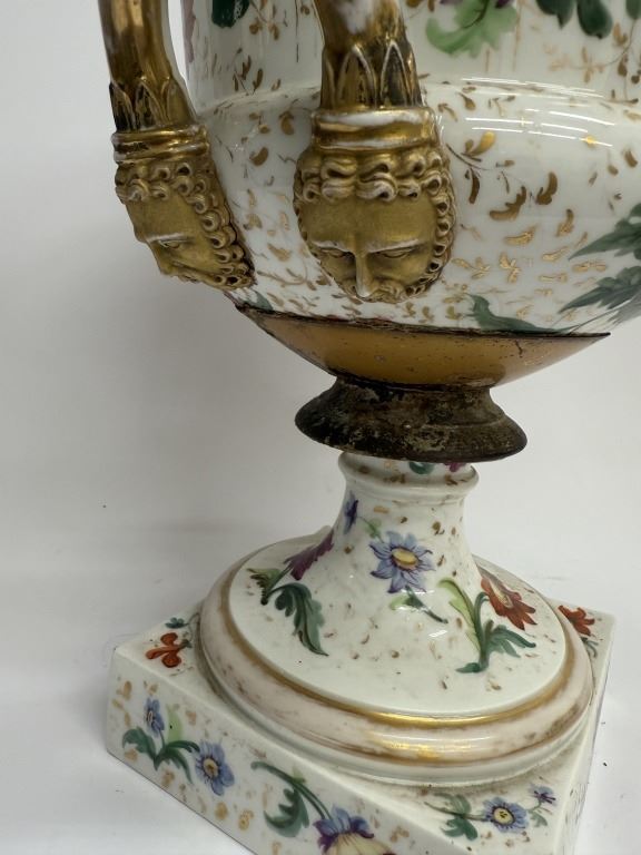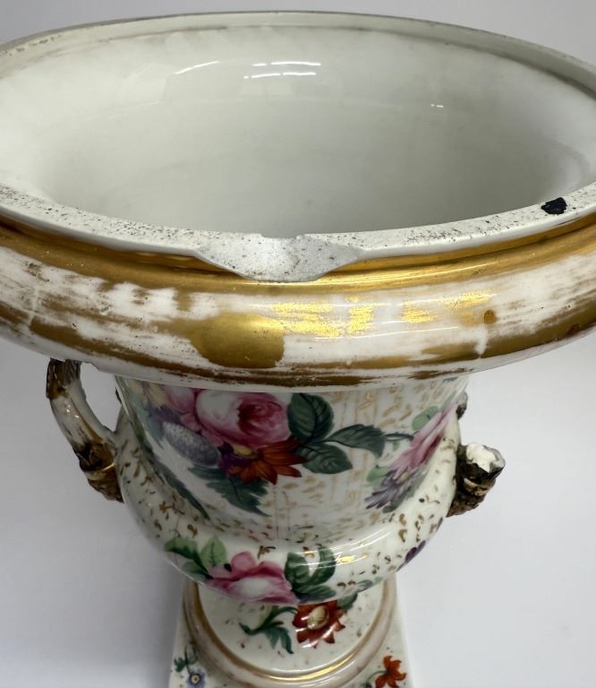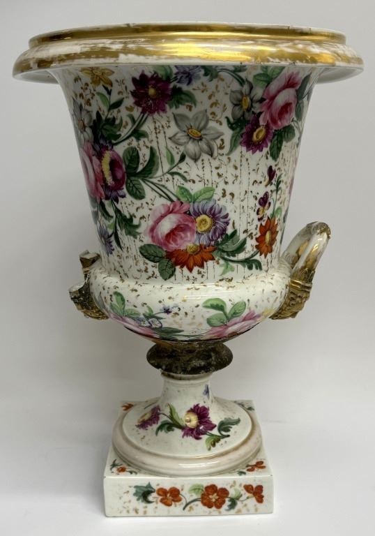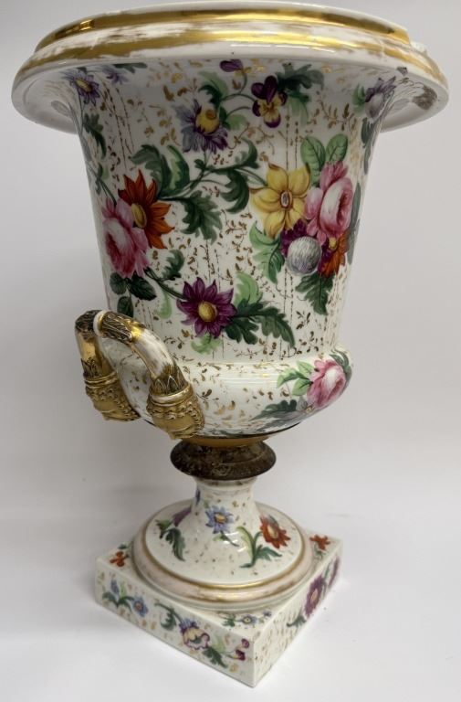 Item/Description: Featuring a 19th-century Old Paris floral urn vase in a Neoclassical style, adorned with vibrant colors and gold accents.