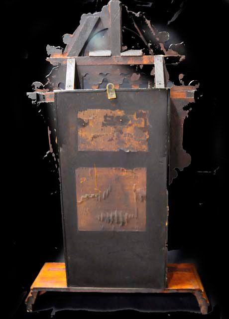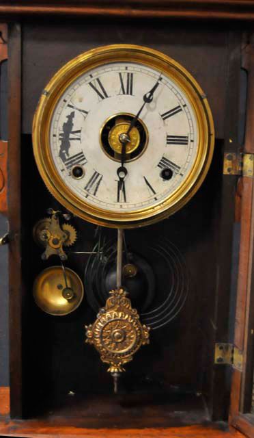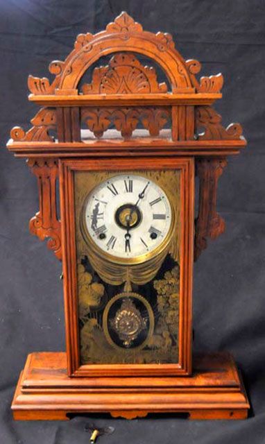 With painted design "Father Time" on glass. Face worn. With pendulum & key. Please read our terms of sale.