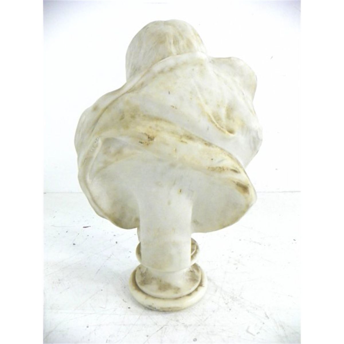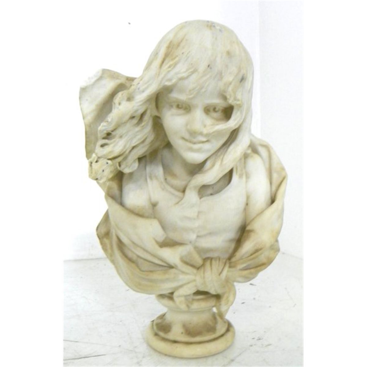 1 chip approx. 1" on shawl & 0.5" chip in hair (we have the piece). Approx. 22" H. From a Long Island estate. Please read our terms of sale.