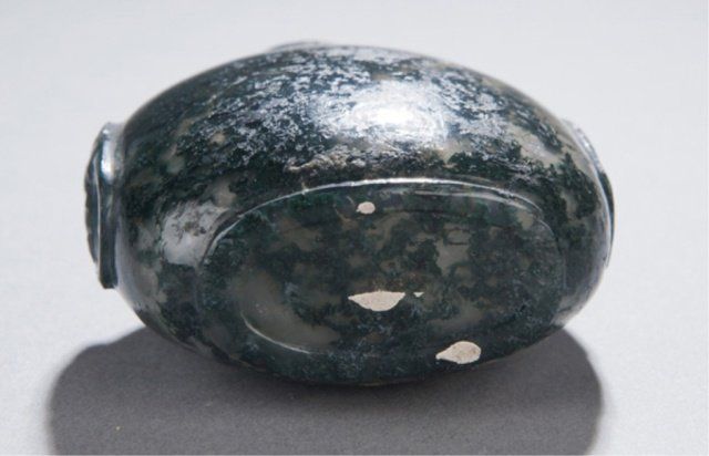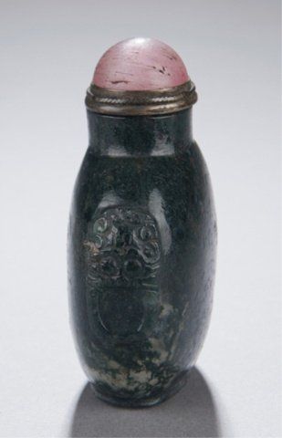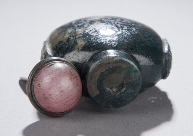 A moss agate snuff bottle. 19th century. Well hollowed with mask handles and metal spoon. 2 3/8"h. Property of Edward Englehart