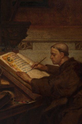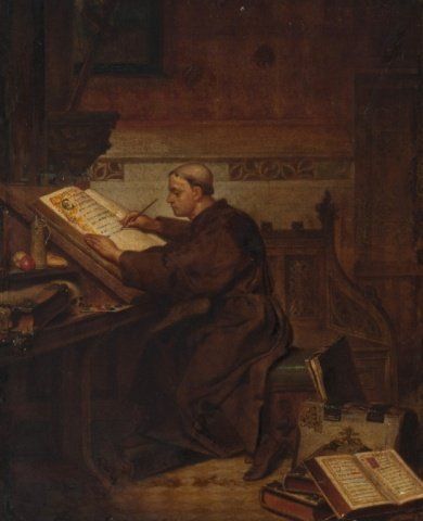 Interior scene of monk writing. Oil on canvas applied to board. Signed at l.l., possibly, "A. Lawrie 1857". In scrolling leaf frame. 27" x 22". Frame: 33" x 28".