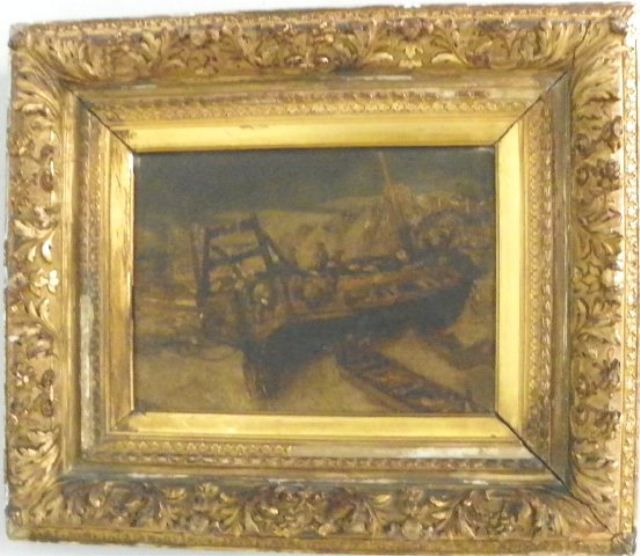 "Ship", needs some restoration. Approx. 9.5" x 13.25". Please read our terms of sale.