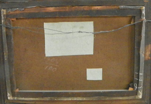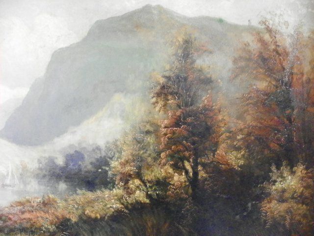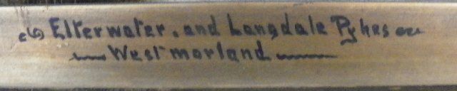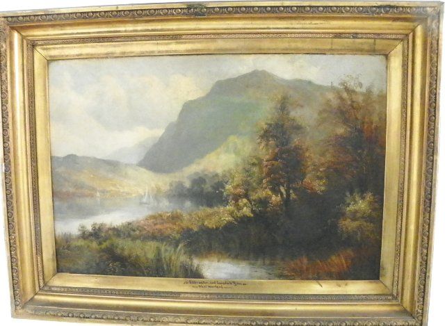 1- 19th c. "Landscape with Lake & Mountains", artist signed lower left illegible & signed on the front Elterwater & Langdale Pikes West Moreland, some patches on back & small rip. Approx. 20" H x 30" W. From Sutton Place, NYC estate.