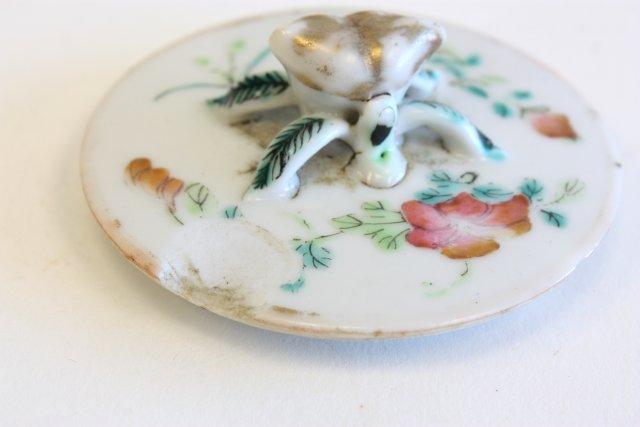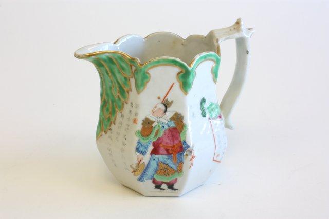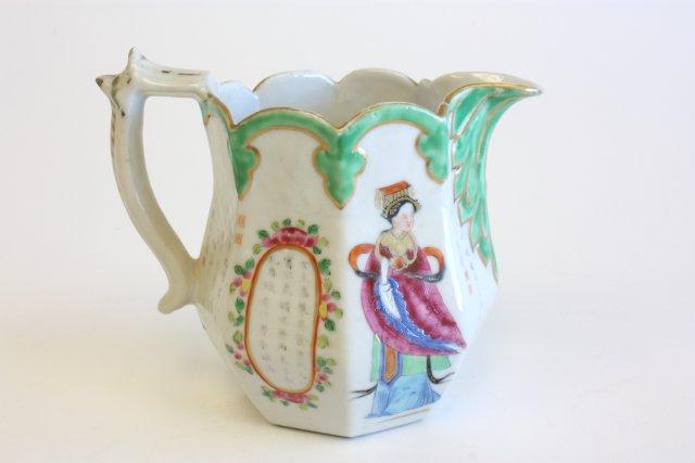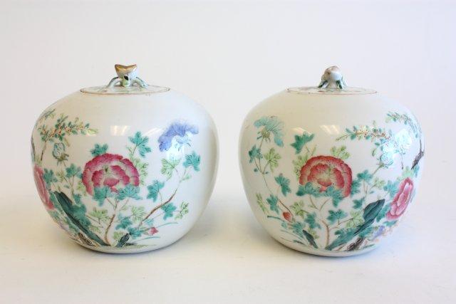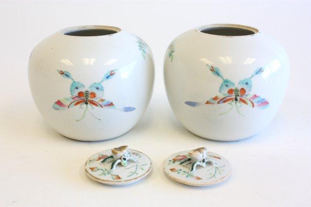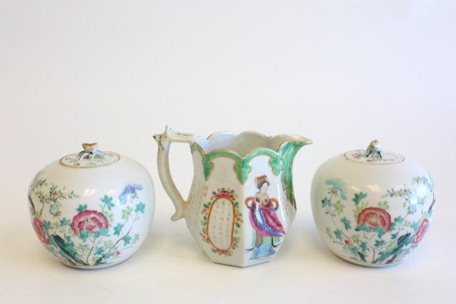 1-19th c. pitcher, approx. 5 1/2" H x 6 1/2" W. Jars have lids approx. 5" D x 5" H, one lid as is, some paint loss.
