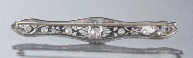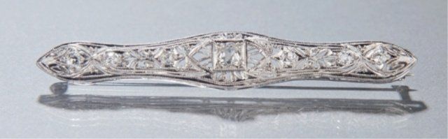 A 19th c. platinum bar pin with diamonds filigreed with large center European cut diamond and 3 smaller diamonds on each side, 0.75 TCW. 2 1/2"l. 0.205 t oz.