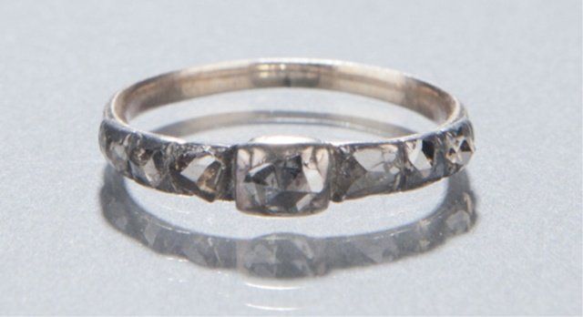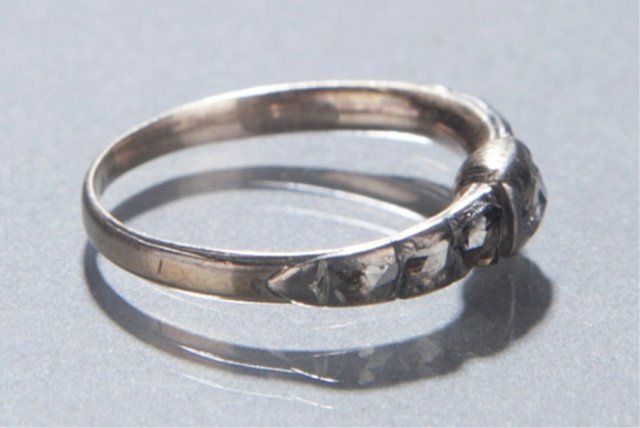 A 19th c. silver ring with 7 rose cut diamonds. Size 5. Tw 0.06 t oz.
