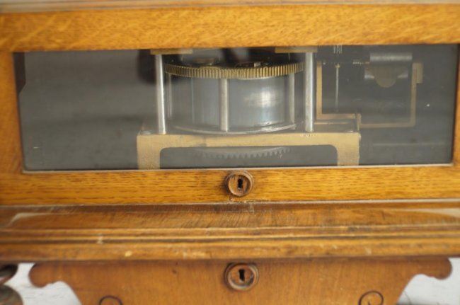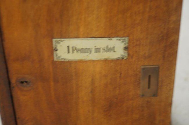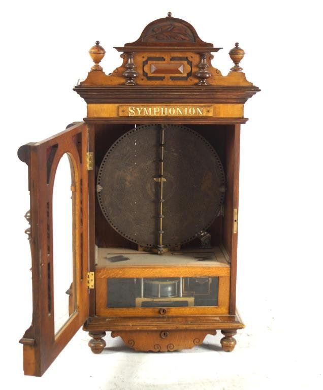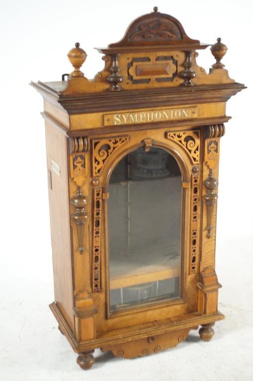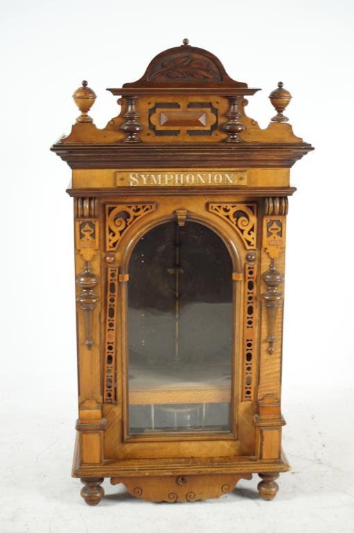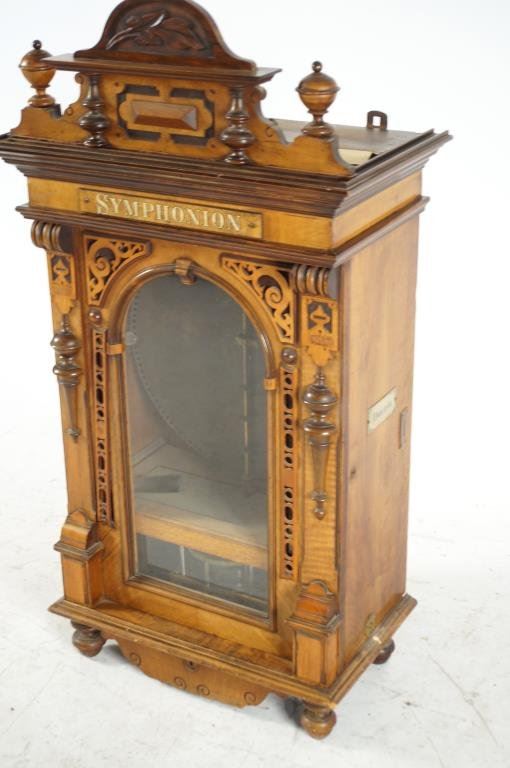Burl walnut Symphonion coin operated 1c upright disc music box - ca 1880 with twelve 19" discs (Wall mount or table top) measures 48" x 25" x 15" - plays well, good condition