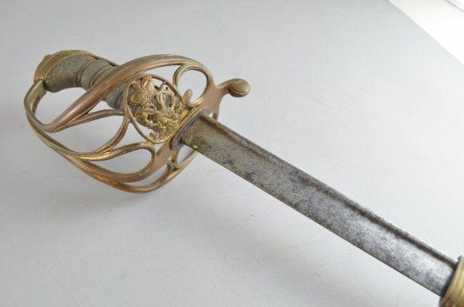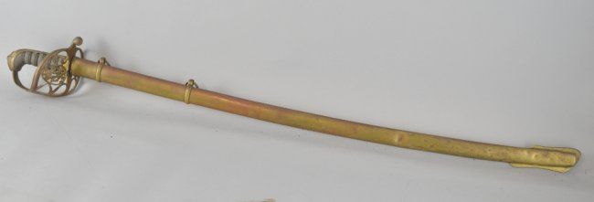 19th century 1845 pattern sword with brass handle and shagreen grip, brass scabbard, engraved curved blade, 40" overall