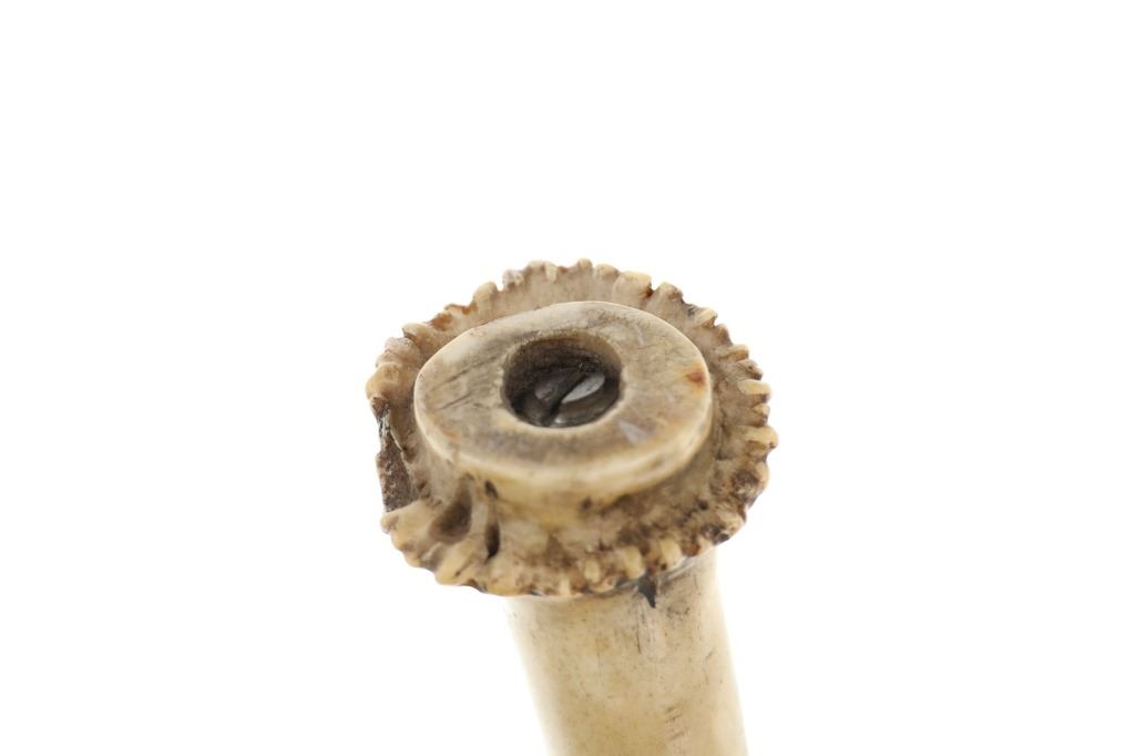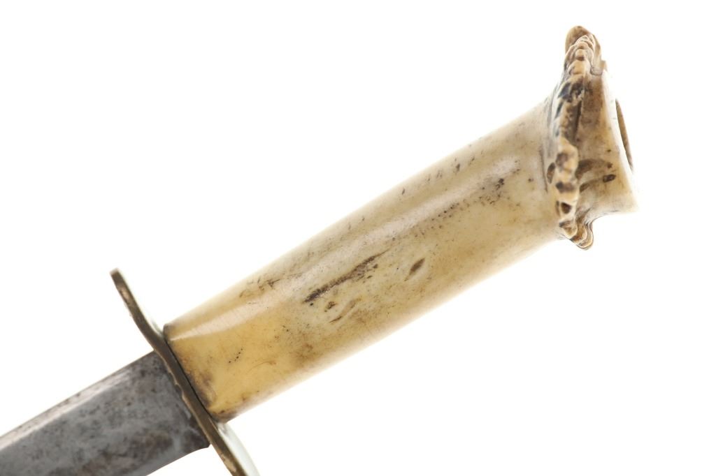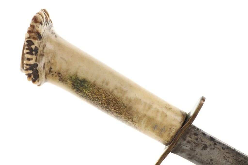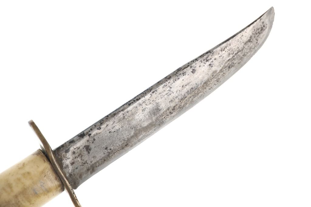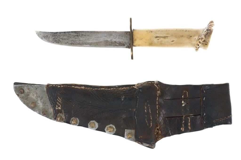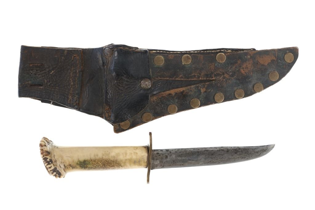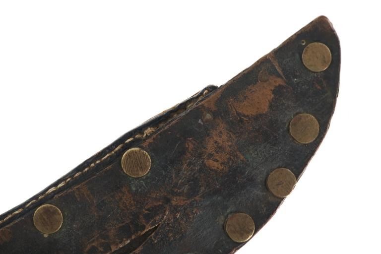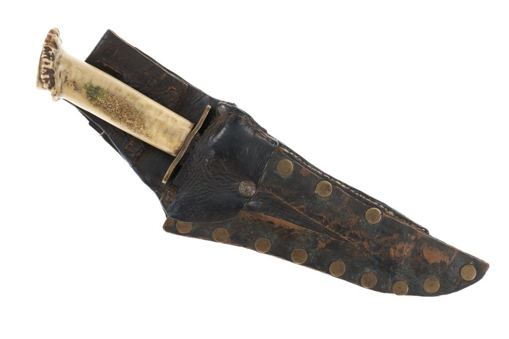 This is an impressive late-19th-century Apache antler fighting belt knife and harness leather sheath. The sheath exhibits brass bullet casings, a unique solid copper "V" shaped plate along the top front of the harness saddle trade leather sheath. In addition to the solid copper front panel the sheath a metal backing and bottom tip. The thick commerical harness leath belt sheath also has two stamped button rivets marked "CRESCENT REG. D." The knife itself shows a thick metal clip point fighting or skinning utility blade with solid brass / copper guard and carved antler handle having a slight green dyed coloring in a few spots. Together the set measures 13.25-inches long, sheath by itself is 12 1/8-inches long by 3 7/8-inches wide, knife is 10-inches long.